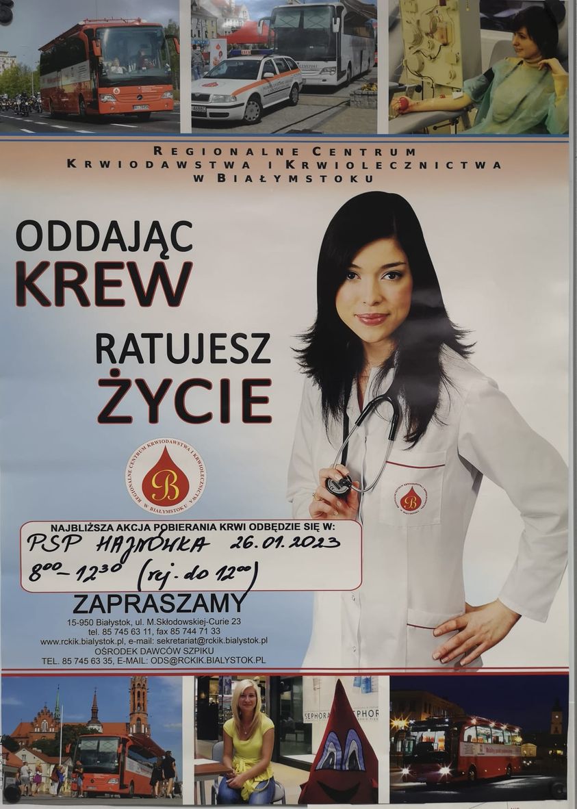 26 stycznia 2023 r. w godzinach 8.00 – 12.30 w Komendzie Powiatowej PSP w Hajnówce organizowana jest akcja „Oddając krew ratujesz życie”.