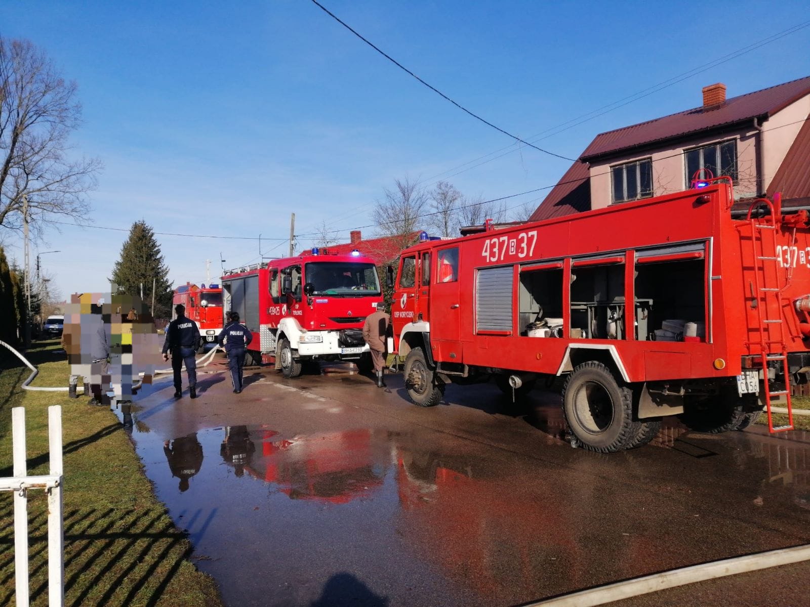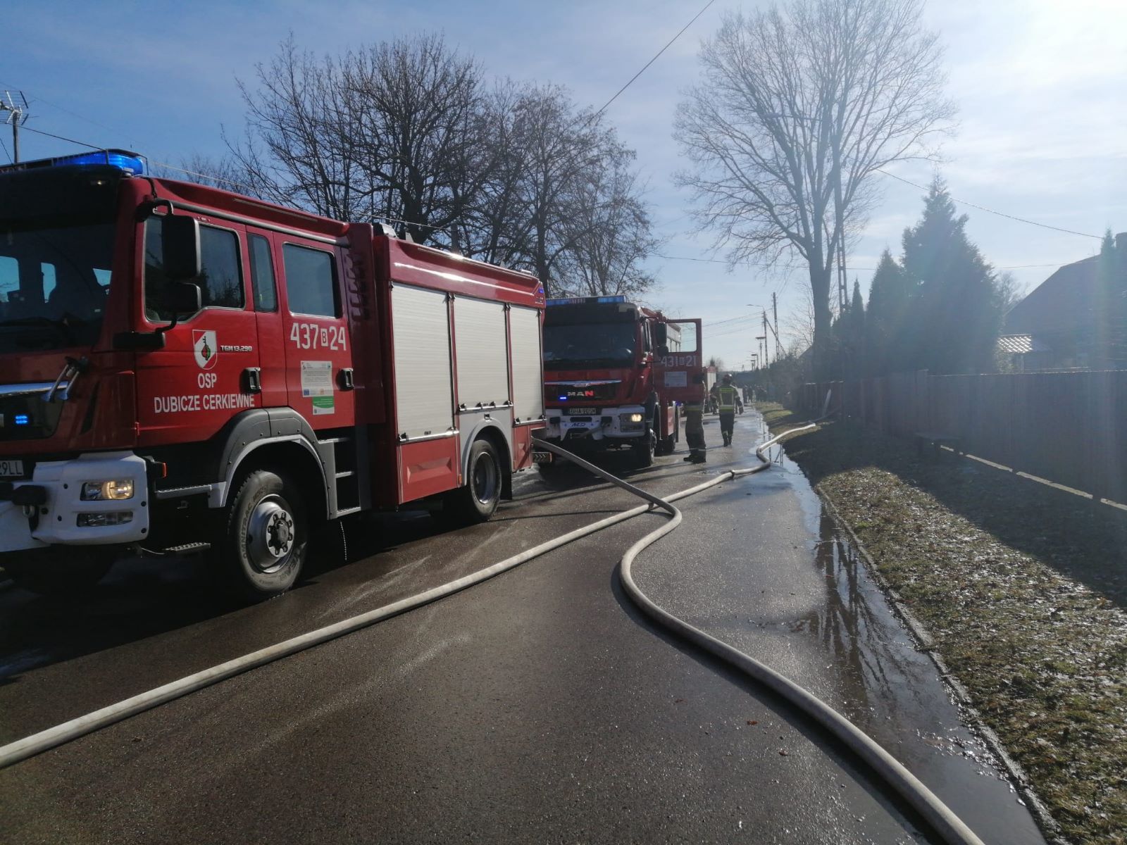 W niedzielę, 12 lutego 2023 r. o godz. 10:44 do Stanowiska Kierowania Komendanta Powiatowego PSP w Hajnówce wpłynęło zgłoszenie o pożarze budynku mieszkalnego jednorodzinnego w miejscowości Koryciski, gm. Dubicze Cerkiewne. Do zdarzenia zadysponowano zastępy z Jednostki Ratowniczo-Gaśniczej w Hajnówce, Posterunku Jednostki Ratowniczo-Gaśniczej w Czeremsze oraz Ochotniczych Straży Pożarnych z Dubicz Cerkiewnych, Tofiłowiec, Korysick, Werstoku i Starego Kornina. Po przybyciu na miejsce zdarzenia pierwszych zastępów stwierdzono, że pożarem objęte jest całe poddasze budynku mieszkalnego jednorodzinnego. Działania zastępów polegały na zabezpieczeniu miejsca zdarzenia oraz podaniu dwóch prądów wody w natarciu na płonące poddasze przez otwory okienne w szczytach budynku. Następnie po przybyciu zastępów z Jednostki Ratowniczo-Gaśniczej w Hajnówce wprowadzono do wnętrza budynku ratowników w sprzęcie ochrony układu oddechowego z kolejnym prądem wody. Rota w trakcie przeszukania budynku odnalazła kota, którego wyniesiono na zewnątrz i przekazano właścicielce. W trakcie działań wyniesiono również butlę z gazem propan-butan na zewnątrz budynku. Po ugaszeniu pożaru przystąpiono do prac rozbiórkowych części drewnianego stropu, elewacji styropianowej oraz zabudowy z płyt gipsowo-kartonowych w celu wyeliminowania wszystkich zarzewi ognia.