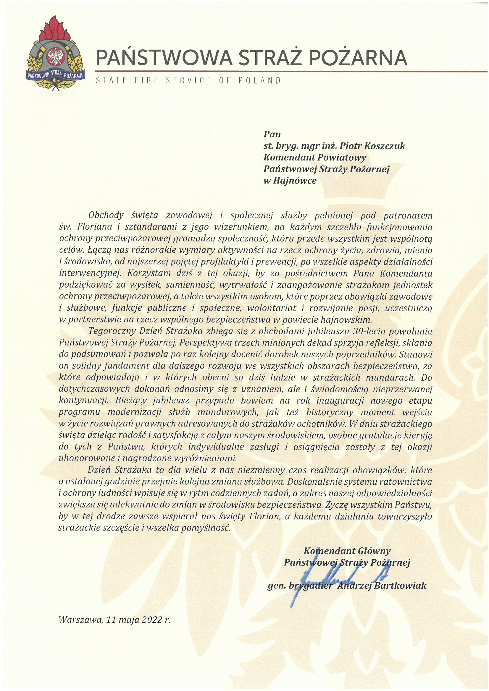 Podlaski Komendant Wojewódzki Państwowej Straży Pożarnej nadał z dniem 4 maja 2022 r. stopień:
