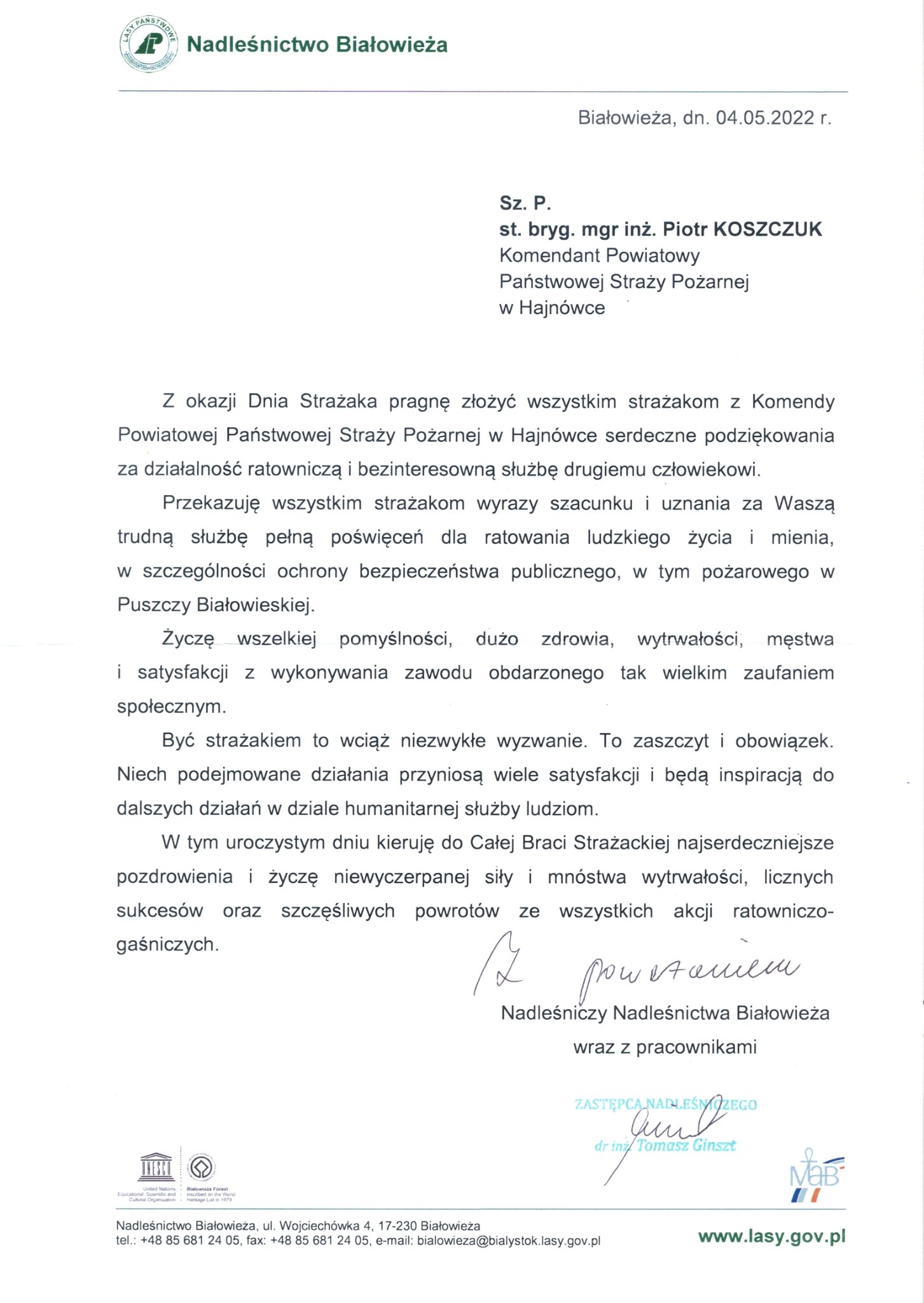 11 maja 2022 r. o godz. 12.00 w budynku lokomotywowni przy siedzibie Nadleśnictwa Hajnówka odbył się uroczysty apel z okazji powiatowych obchodów Dnia Strażaka.