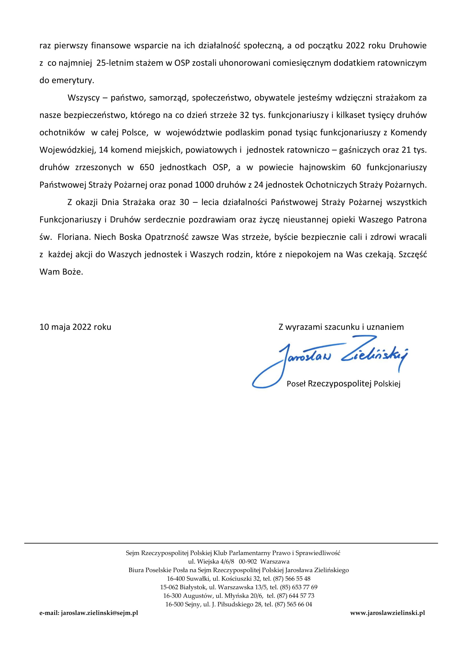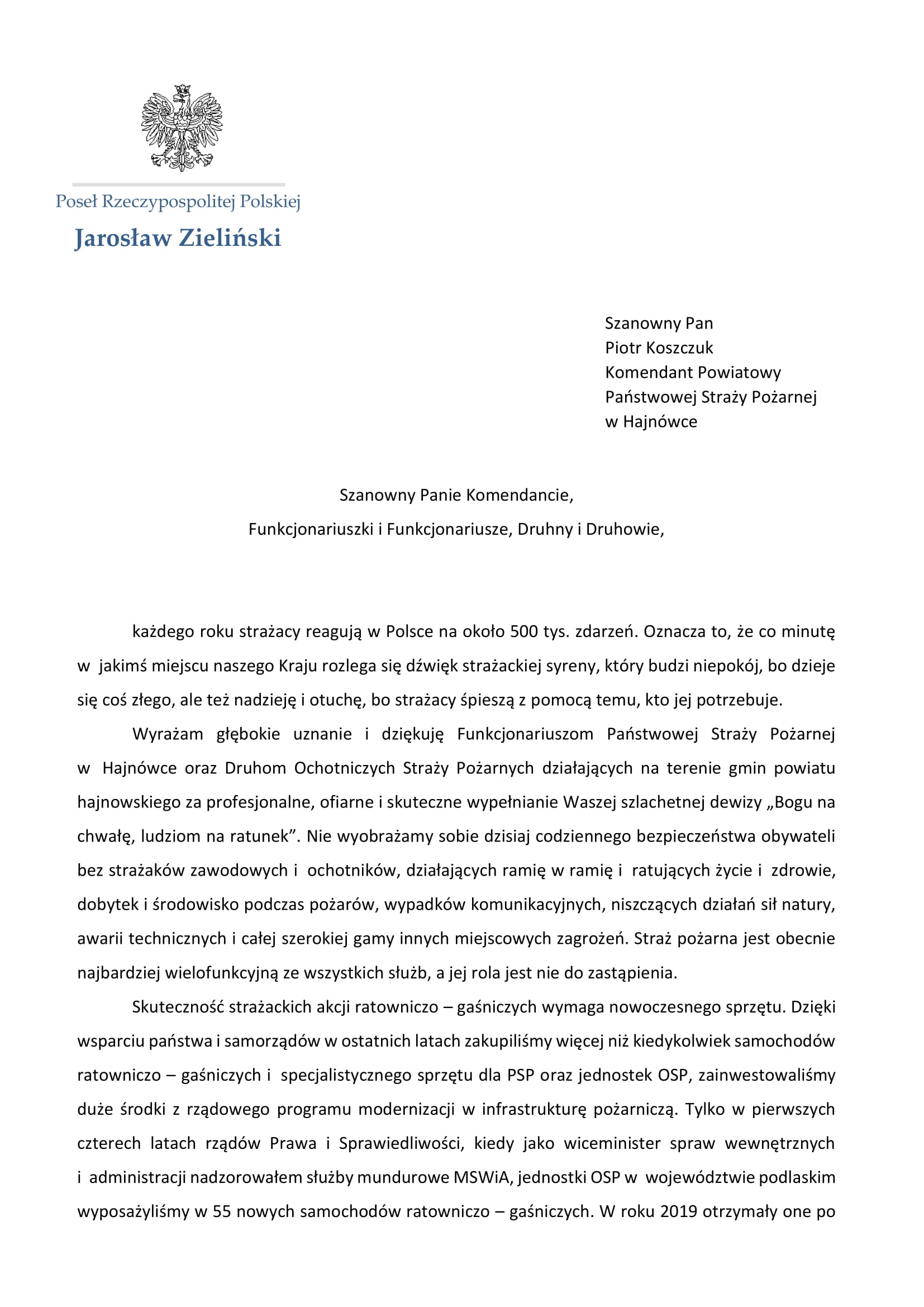 Następnie głos zabrali st. bryg. Sebastian Zdanowicz - Podlaski Komendant Wojewódzki Państwowej Straży Pożarnej, Pan Bohdan Paszkowski Wojewoda Podlaski, dh. Andrzej Koc Prezes Zarządu Oddziału Wojewódzkiego Związku Ochotniczych Straży Pożarnych RP, Pan Andrzej Skiepko Starosta Hajnowski oraz odczytany został list okolicznościowy Pana Jarosława Zielińskiego - Posła na Sejm RP, który niestety z uwagi na obowiązki służbowe nie mógł przybyć na uroczystość.