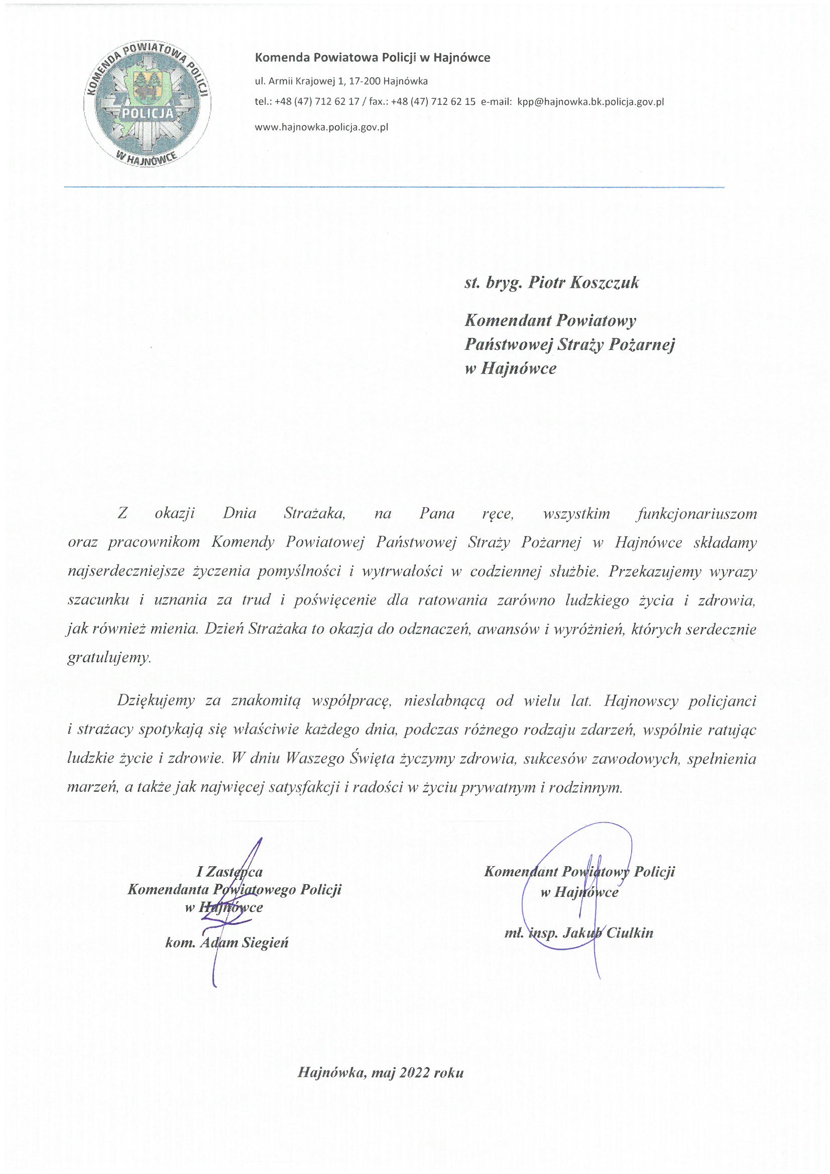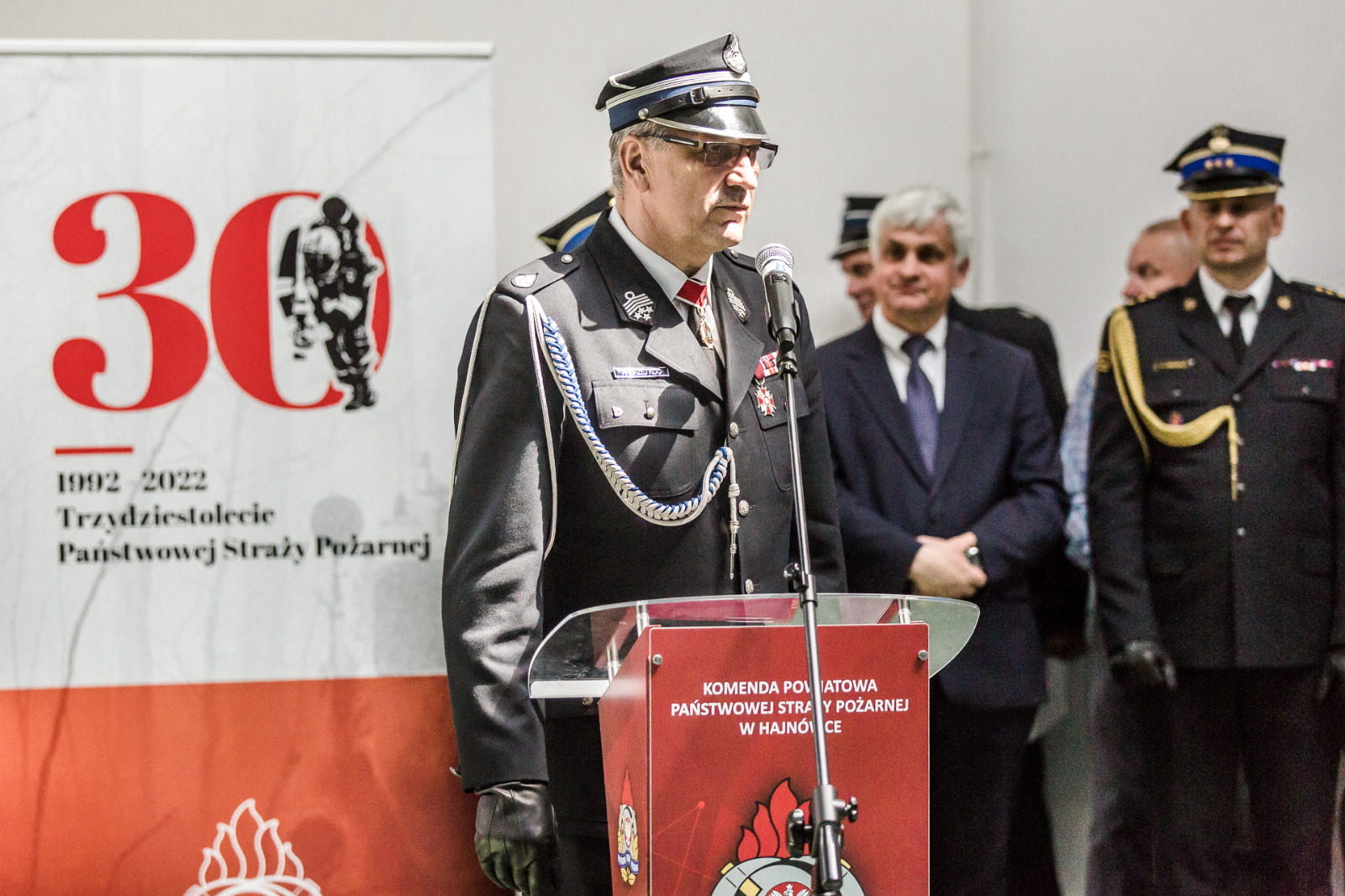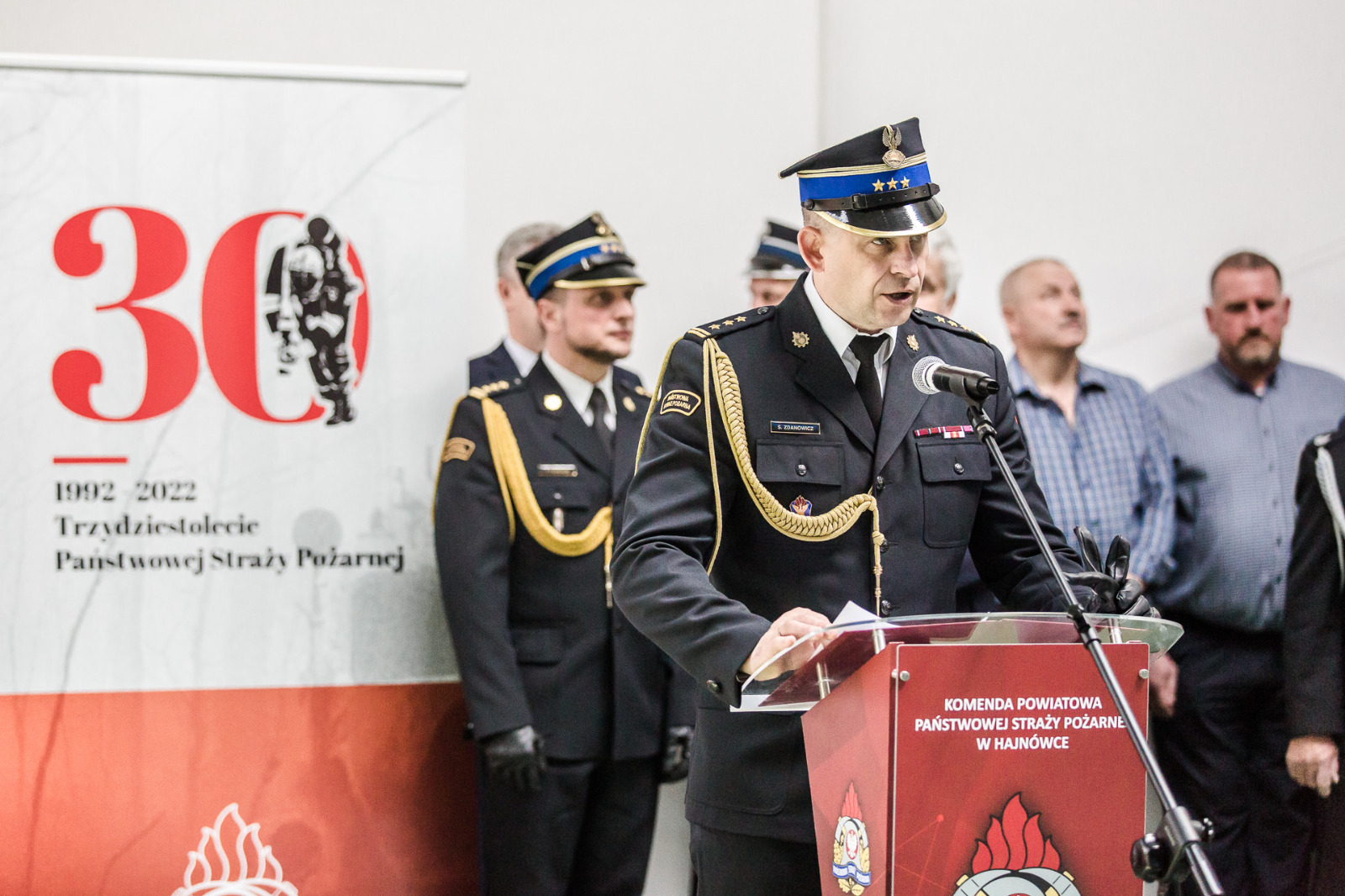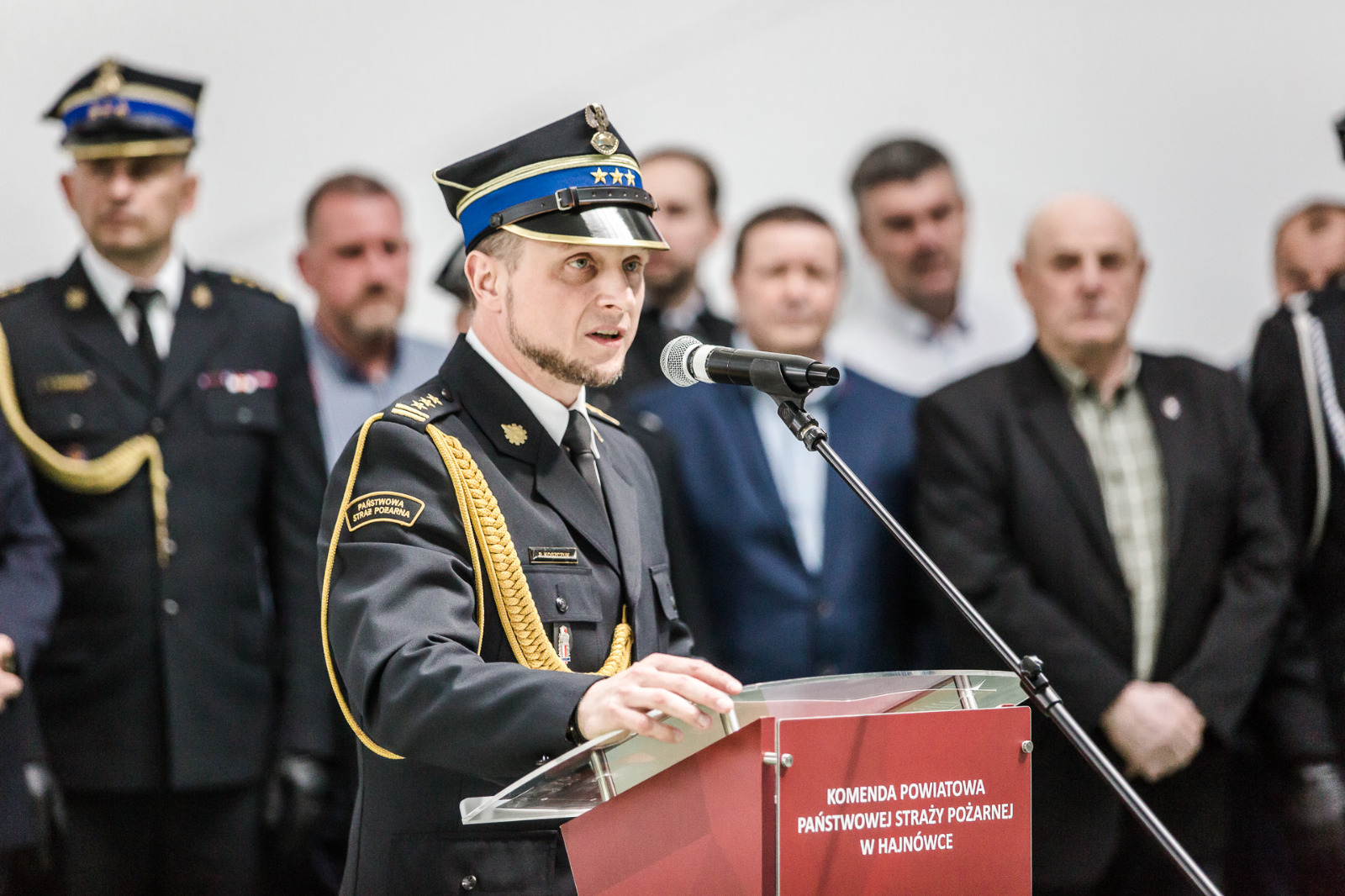 Zaproszonych gości, sympatyków pożarnictwa oraz strażaków powitał komendant powiatowy Państwowej Straży Pożarnej w Hajnówce st. bryg. Piotr Koszczuk. Komendant w swoim wystąpieniu podziękował strażakom Państwowej Straży Pożarnej, druhom ochotniczych straży pożarnych, służbom działającym na rzecz bezpieczeństwa mieszkańców naszego powiatu, władzom samorządowym, przedstawicielom Lasów Państwowych i wszystkim tym, którym pomoc bliźnim i potrzebującym leży głęboko na sercu.