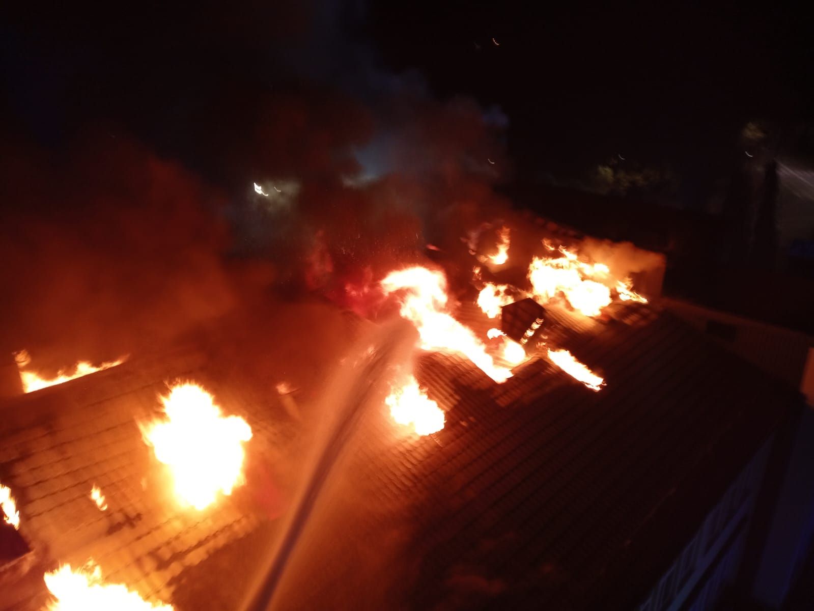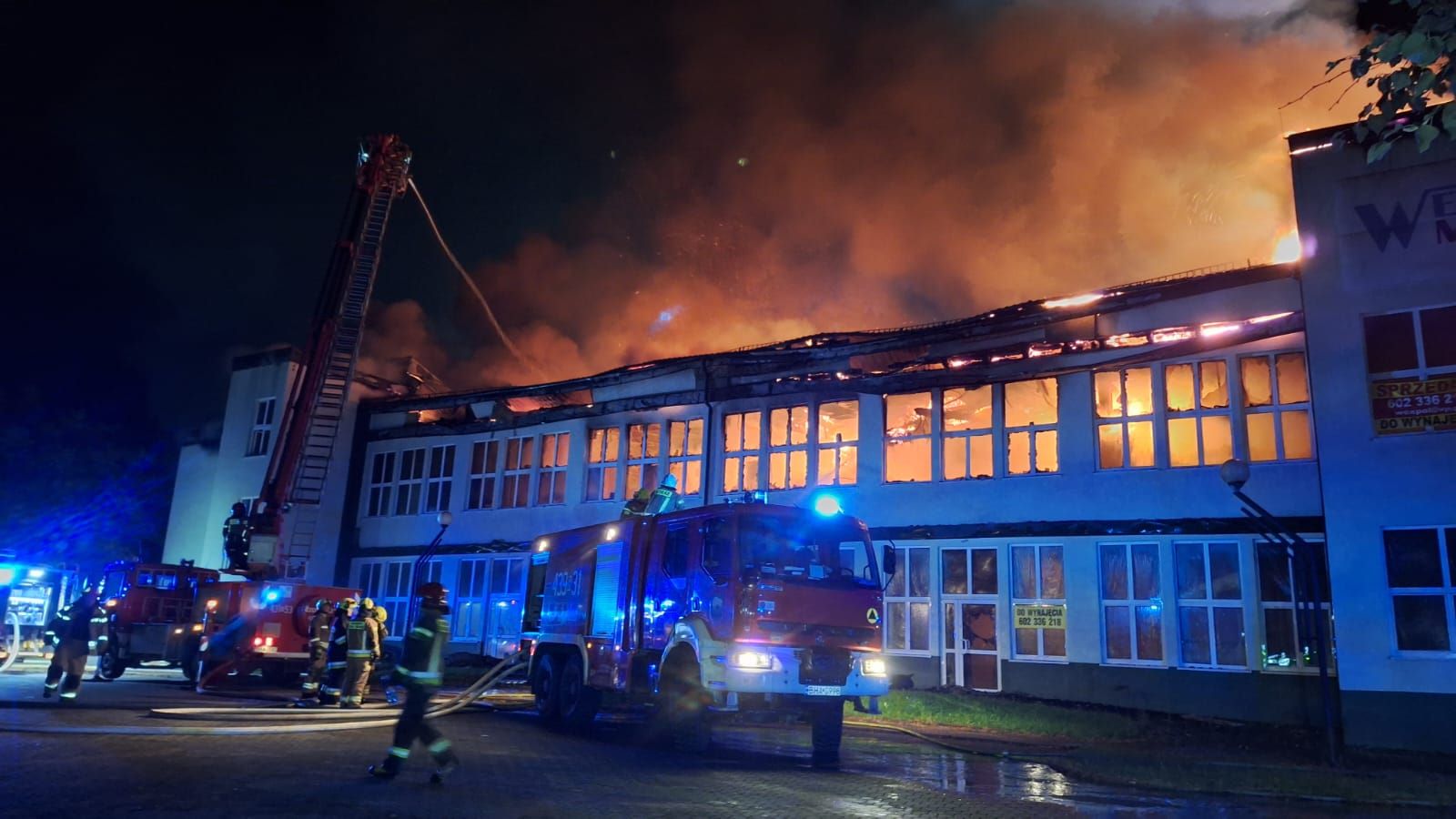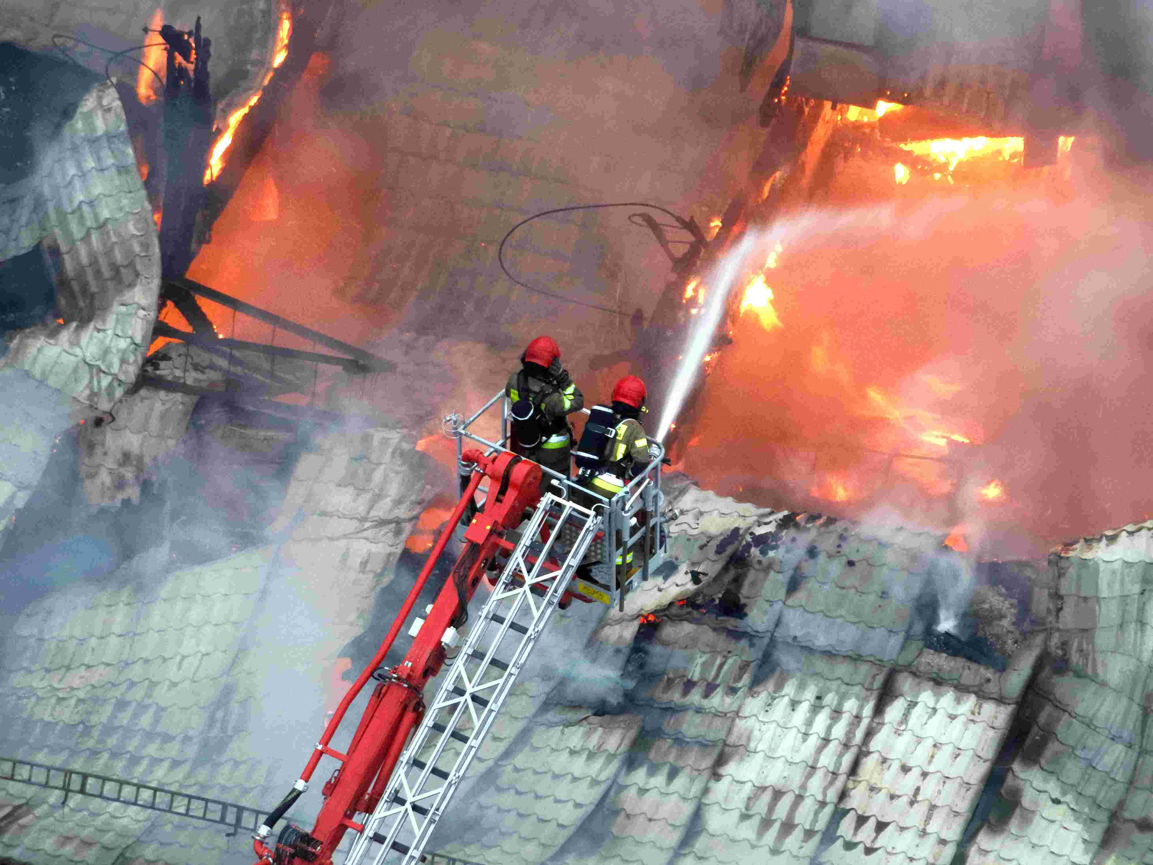 Po przybyciu strażaków na miejsce zdarzenia zgłoszenie się potwierdziło – na poddaszu trzykondygnacyjnego, drewnianego, ocieplonego wełną mineralną i krytego blachą budynku handlowego panowało zadymienie a dym wydobywał się za zewnątrz. Po wejściu strażaków do budynku okazało się, że całe poddasze objęte jest ogniem. W początkowej fazie akcji gaśniczej działania prowadzone były z zewnątrz oraz wewnątrz budynku. Palna konstrukcja budynku (drewniane ściany, stropy, więźba dachowa) sprzyjała szybkiemu rozwojowi pożaru. Ze względu na sytuację pożarową a także szybko postępujące osłabienie elementów nośnych konstrukcji strażacy zostali wycofani z pomieszczeń na zewnątrz.
