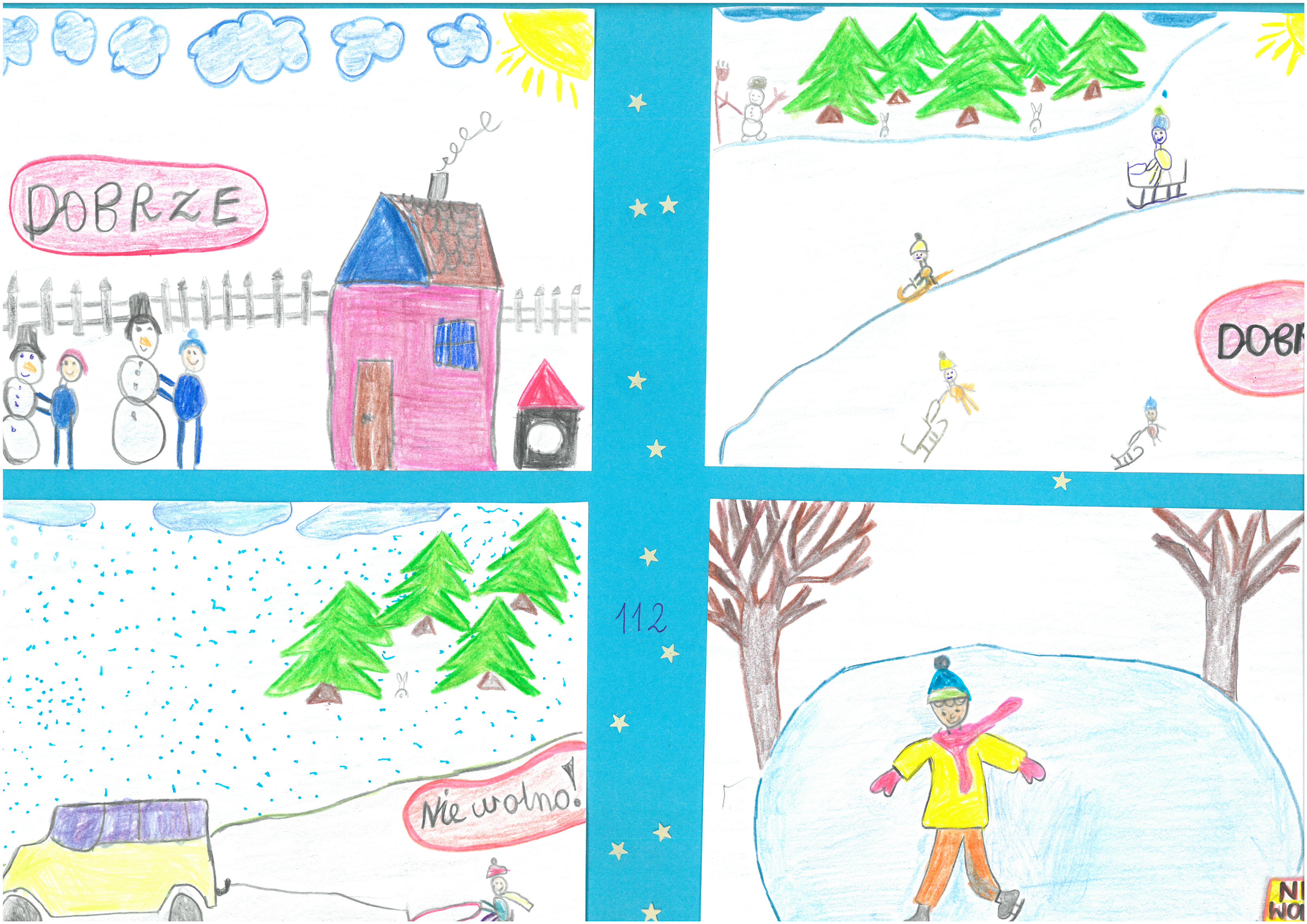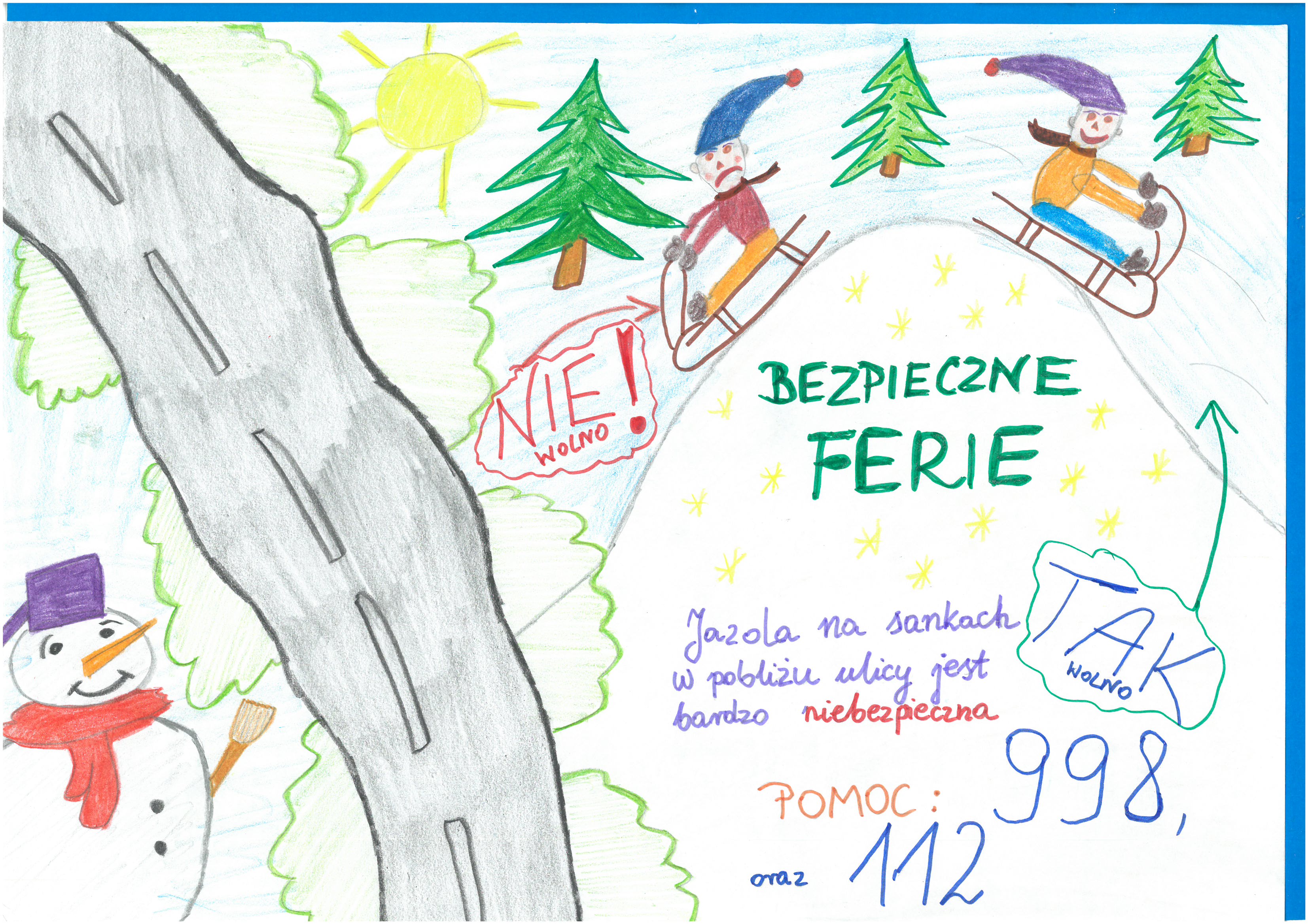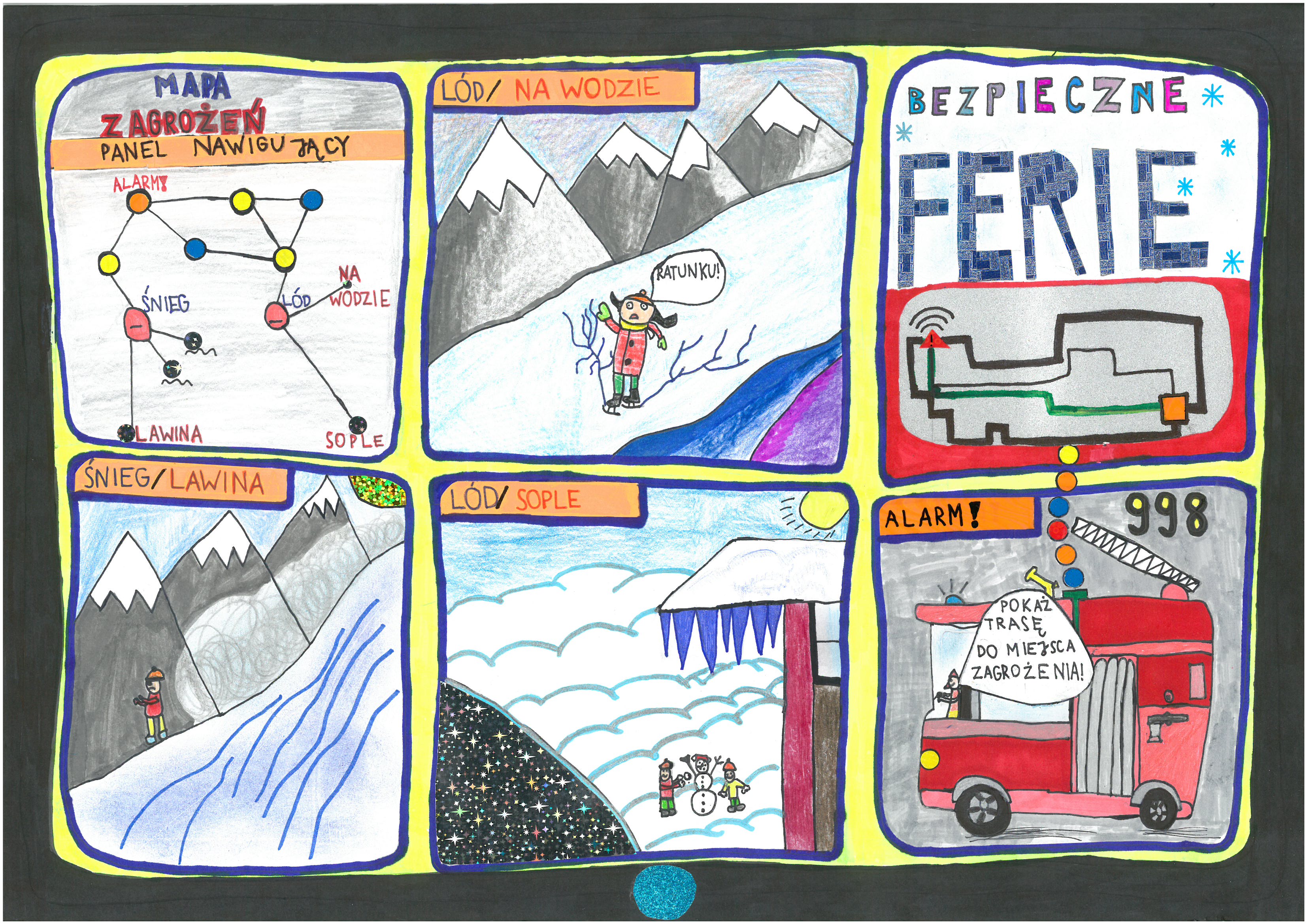 Tematyka prac plastycznych nawiązywała do zagrożeń związanych z wypoczynkiem podczas ferii zimowych oraz zapewnienia właściwej ewakuacji i sposobów powiadamiania służb ratowniczych. Wszystkie prace zostały przygotowane z wielką starannością, jednak Komisja wyłoniła trzech zwycięzców oraz wyróżniła ośmiu uczestników: