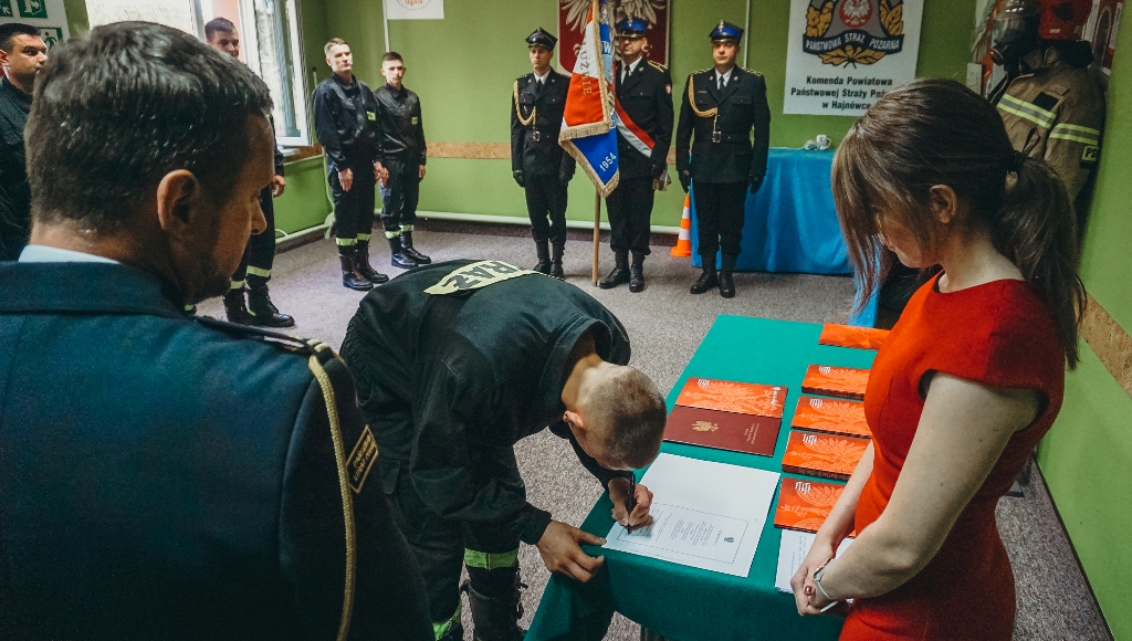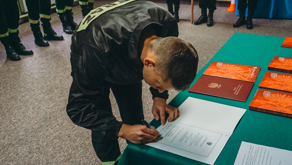 Złożyli podpis pod aktem ślubowania oraz otrzymali z rąk st. bryg. Piotra Koszczuka Komendanta Powiatowego PSP w Hajnówce gratulacje i życzenia rozwoju zawodowego oraz satysfakcji z pełnionej służby. To wyjątkowa i podniosła chwila w życiu każdego strażaka. Po długim i trudnym postępowaniu kwalifikacyjnym strażacy oficjalnie rozpoczynają służbę. Przed nimi jeszcze niespełna czteromiesięczny kurs zawodowy.