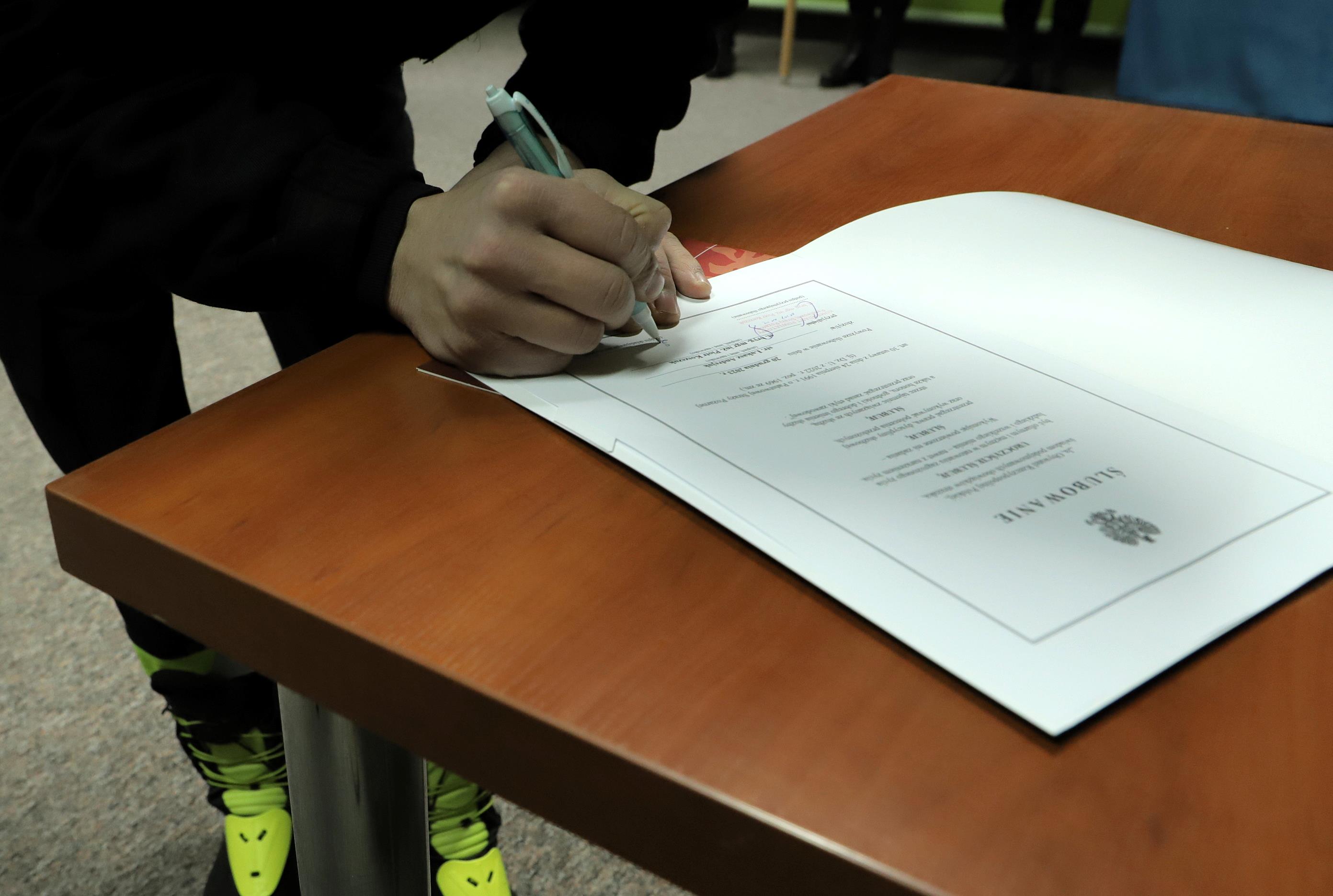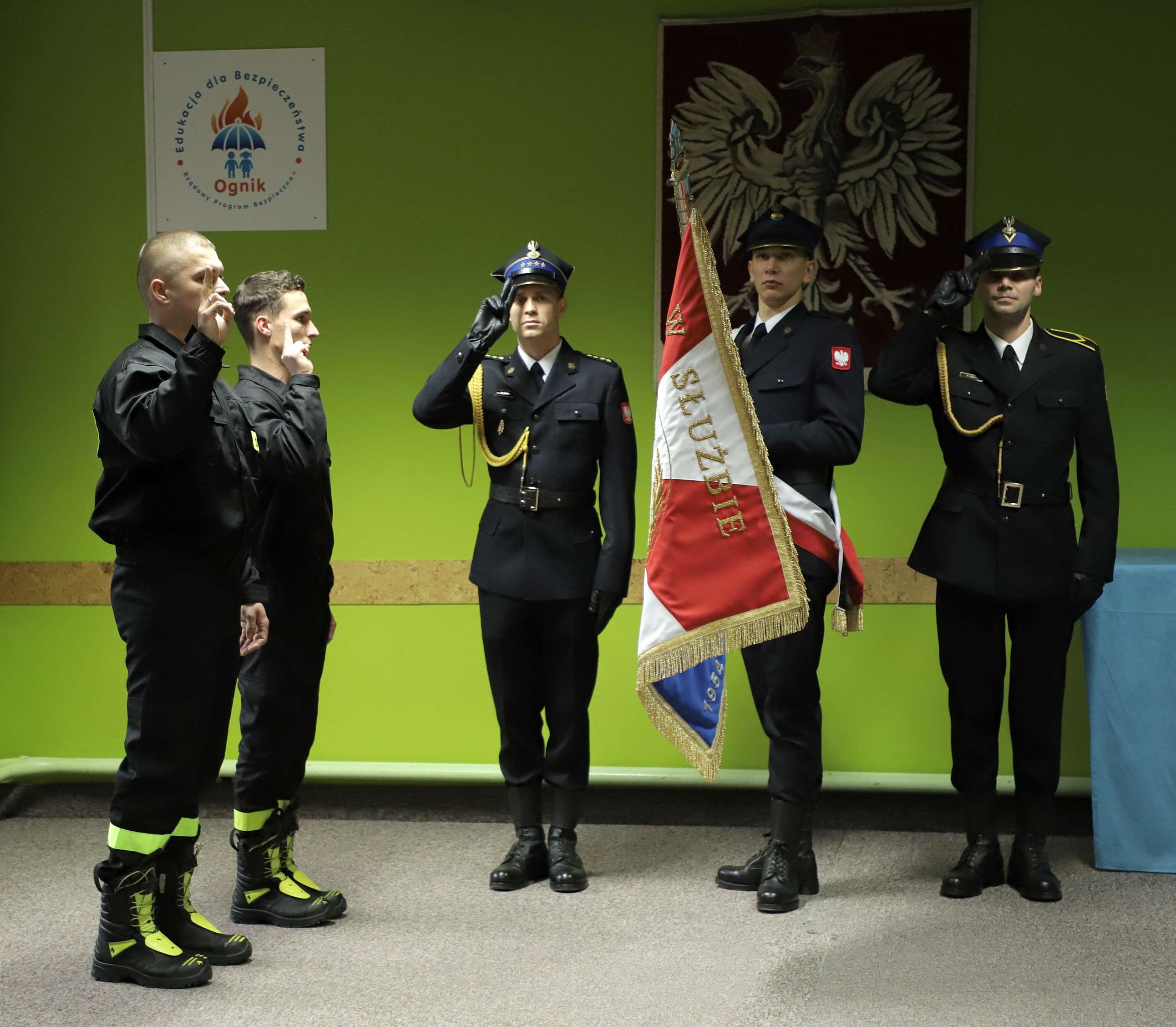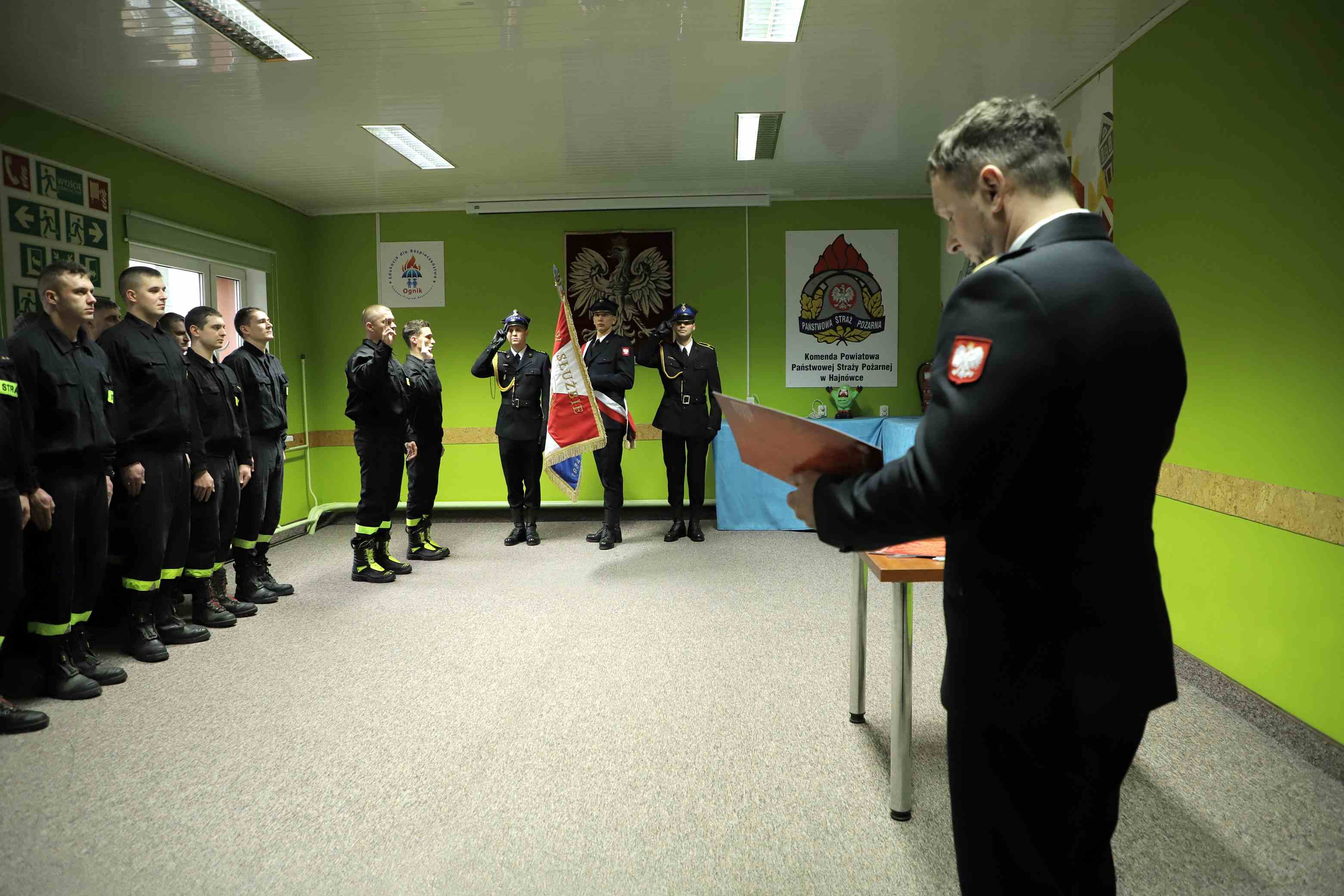 Uroczystość ślubowania rozpoczęła się od złożenia meldunku Komendantowi Powiatowemu Państwowej Straży Pożarnej w Hajnówce st. bryg. Piotrowi Koszczukowi. Następnie nowo przyjęci strażacy złożyli ślubowanie na sztandar Komendy Powiatowej PSP w Hajnówce oraz złożyli podpis pod aktem ślubowania. Strażak Krystian Ługowski oraz strażak Łukasz Andrejuk w przemówieniu Komendanta oficjalnie zostali powitany wśród funkcjonariuszy KP PSP w Hajnówce a także odebrali gratulacje i życzenia rozwoju zawodowego i satysfakcji z pełnionej służby.