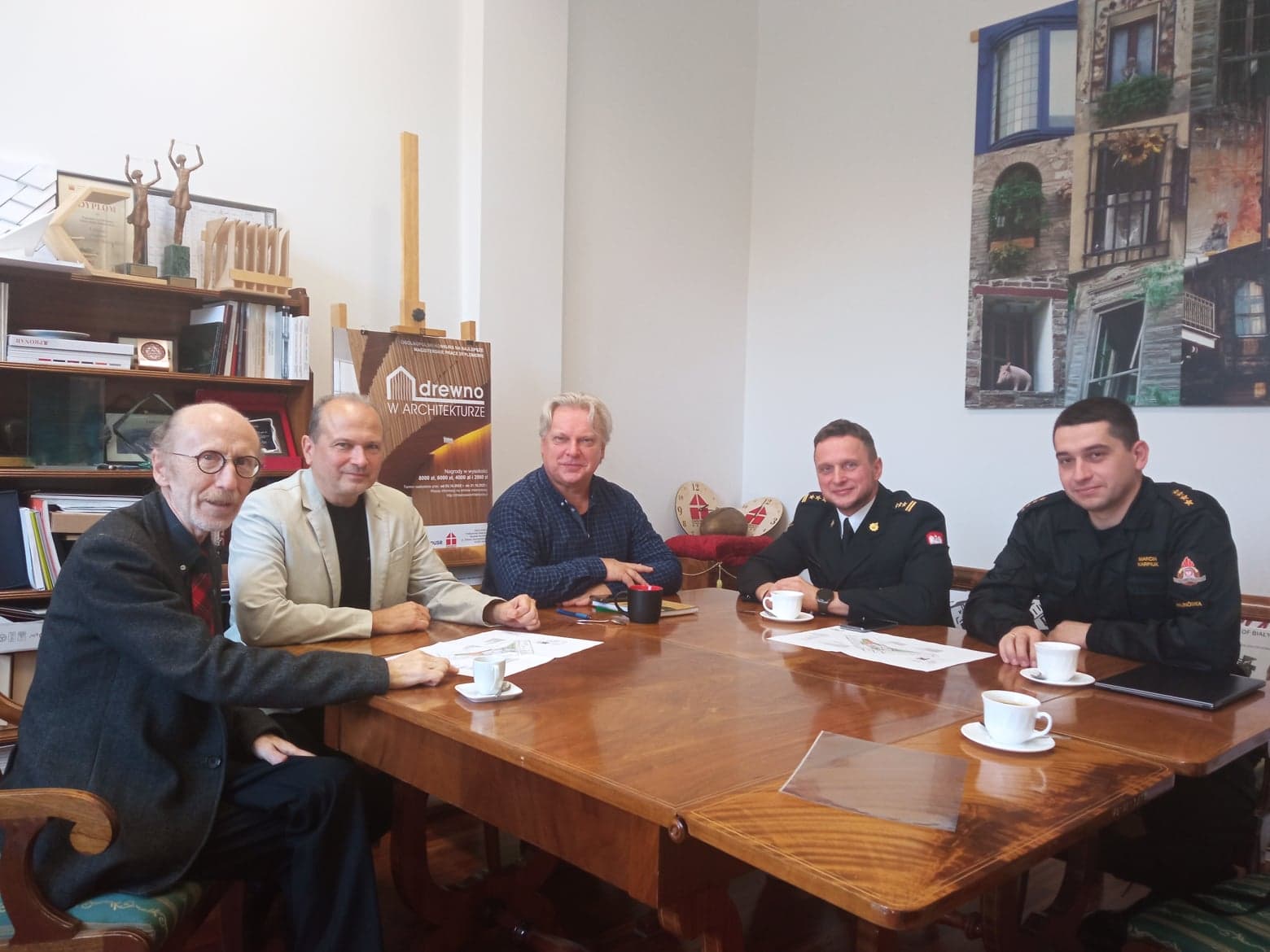 st. bryg. Piotr Koszczuk Komendant Powiatowy PSP w Hajnówce omówił z dr hab. inż. arch. Aleksandrem Asanowiczem prof. PB Dziekanem Wydziału Architektury, dr inż. arch. Adamem Jakimowiczem Prodziekanem ds. Rozwoju i Współpracy oraz dr inż. arch. Robertem Misiukiem, możliwości oraz zakres ogłoszenia konkursu na koncepcje zagospodarowania przestrzennego oraz wizualizację pomieszczeń Komendy Powiatowej PSP w Hajnówce.