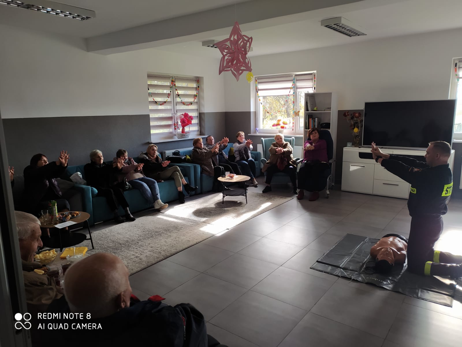 Kolejnym etapem warsztatów była krótka lekcja pierwszej pomocy. Seniorzy mogli się dowiedzieć jak należy postępować w określonych sytuacjach zagrożenia życia lub zdrowia. Przedstawiono informacje, które należy przekazywać dyspozytorowi centrum powiadamiania ratunkowego oraz zasady korzystania z numerów alarmowych. Uczestnicy warsztatów mogli także przećwiczyć na fantomie resuscytację krążeniowo – oddechową.