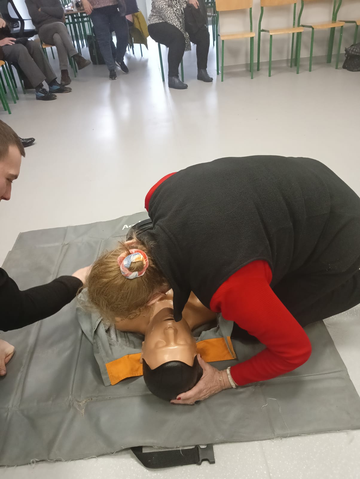 Zajęcia praktyczne poprzedzone były krótkim teoretycznym wprowadzeniem. Przedstawiono informacje, które należy przekazywać dyspozytorowi centrum powiadamiania ratunkowego oraz zasady korzystania z numerów alarmowych. Następnie seniorzy ćwiczyli na fantomach udrażnianie dróg oddechowych u osób poszkodowanych, przeprowadzanie resuscytacji krążeniowo-oddechowej oraz obsługę defibrylatora AED.