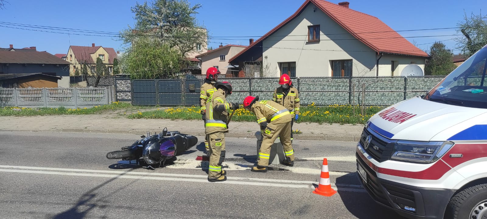 11 maja o godz. 10.35 do Stanowiska Kierowania Komendanta Powiatowego PSP w Hajnówce wpłynęło zgłoszenie o zderzeniu motocykla oraz samochodu osobowego w Hajnówce przy ul. Bielskiej. Na miejsce zadysponowano trzy zastępy z Jednostki Ratowniczo-Gaśniczej w Hajnówce. Po przybyciu na miejsce zdarzenie zastępów z JRG Hajnówka stwierdzono, że doszło do zderzenia motocykla marki Honda z samochodem osobowym marki Ford. W wyniku zderzenia poszkodowany został kierujący motocyklem, który leżał na chodniku i był pod opieką policji, która udzielała mu kwalifikowanej pierwszej pomocy. Działania zastępów straży polegały na zabezpieczeniu miejsca zdarzenia, zabezpieczenia wycieków płynów eksploatacyjnych sorbentem oraz pomocy w transporcie poszkodowanego do karetki.