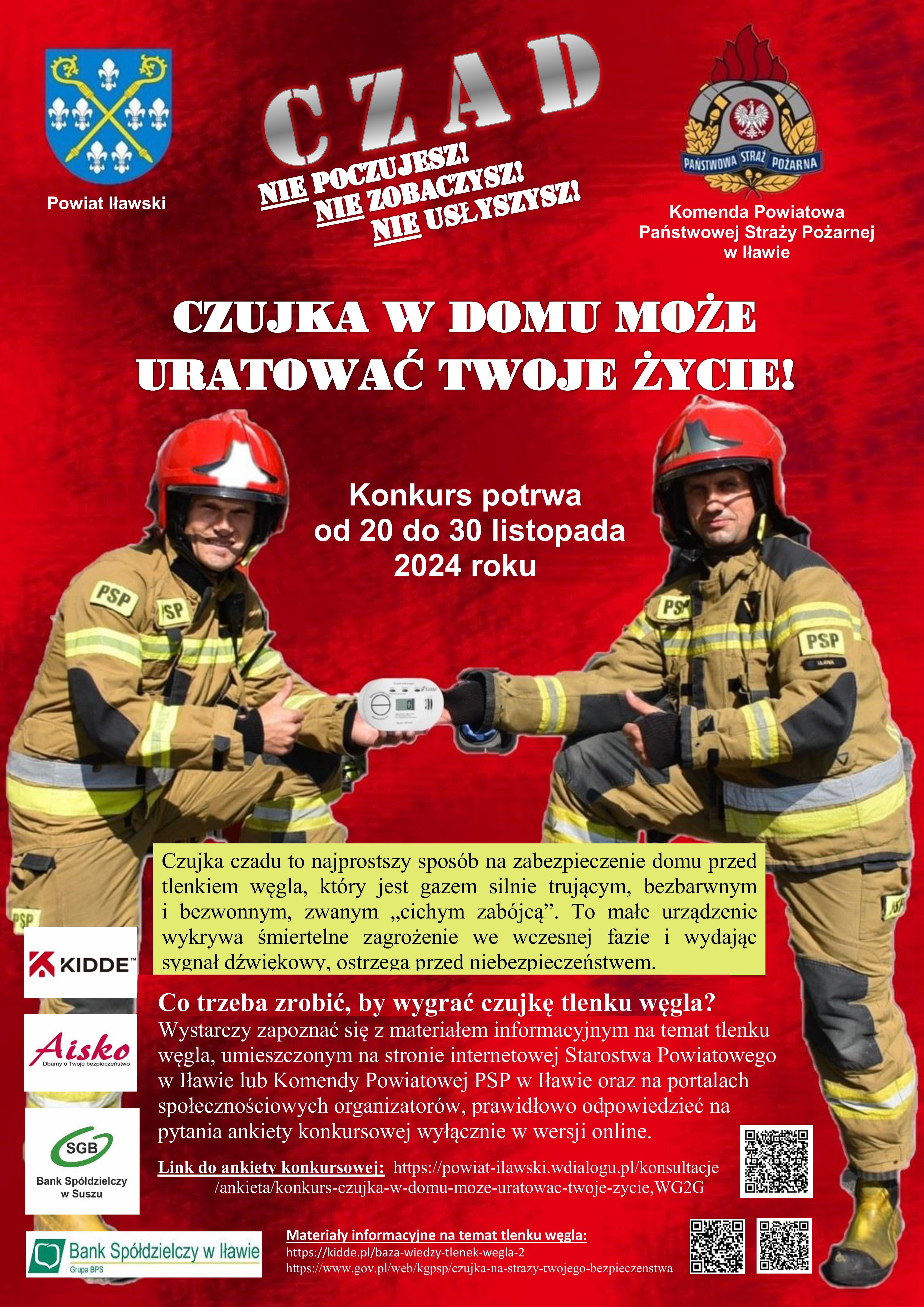 W trosce o bezpieczeństwo mieszkańców powiatu iławskiego ogłaszamy konkurs „Czujka w domu może uratować Twoje życie”. Organizatorem przedsięwzięcia jest Starostwo Powiatowe w Iławie oraz Komenda Powiatowa Państwowej Straży Pożarnej w Iławie. Fundatorami nagród – czujek czadu, obok Starostwa Powiatowego w Iławie oraz Komendy Powiatowej Państwowej Straży Pożarnej w Iławie są AISKO Sp.J., Kidde, Bank Spółdzielczy w Iławie oraz Bank Spółdzielczy w Suszu.