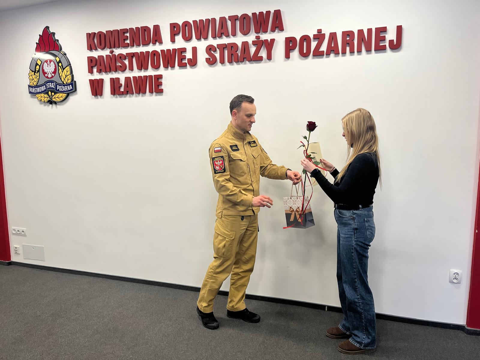 Z tej okazji iławscy strażacy na czele z Komendantem Powiatowym bryg. Marcinem Wiśniewskim złożyli na ręce pani Karoliny Maciejewskiej serdeczne podziękowania za wykonywaną z dużą rzetelnością i oddaniem pracę na rzecz naszej komendy.