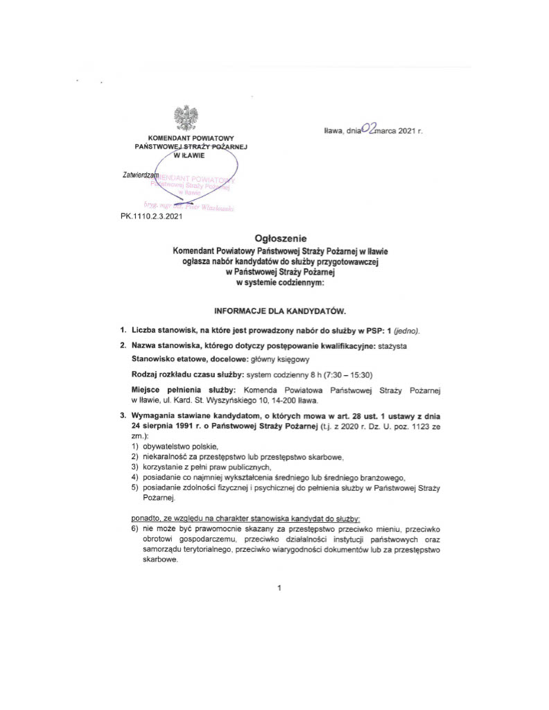 Ogłoszenie Komendant Powiatowy Państwowej Straży Pożarnej w Iławie ogłasza nabór kandydatów do służby przygotowawczej w Państwowej Straży Pożarnej w systemie codziennym