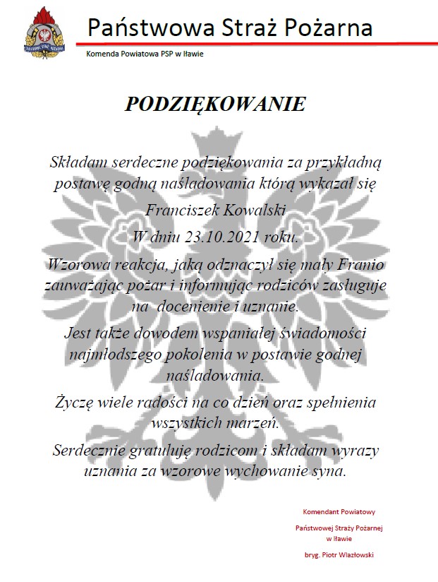 Jadąc wraz z rodzicami 23 października samochodem zauważył pożar budynków gospodarczych w miejscowości Nowa Wieś, natychmiast poinformował o tym swoich rodziców, którzy zgłosili to zdarzenie i co ważne podjechali bliżej i dokładnie wskazali miejsce groźnego pożaru.