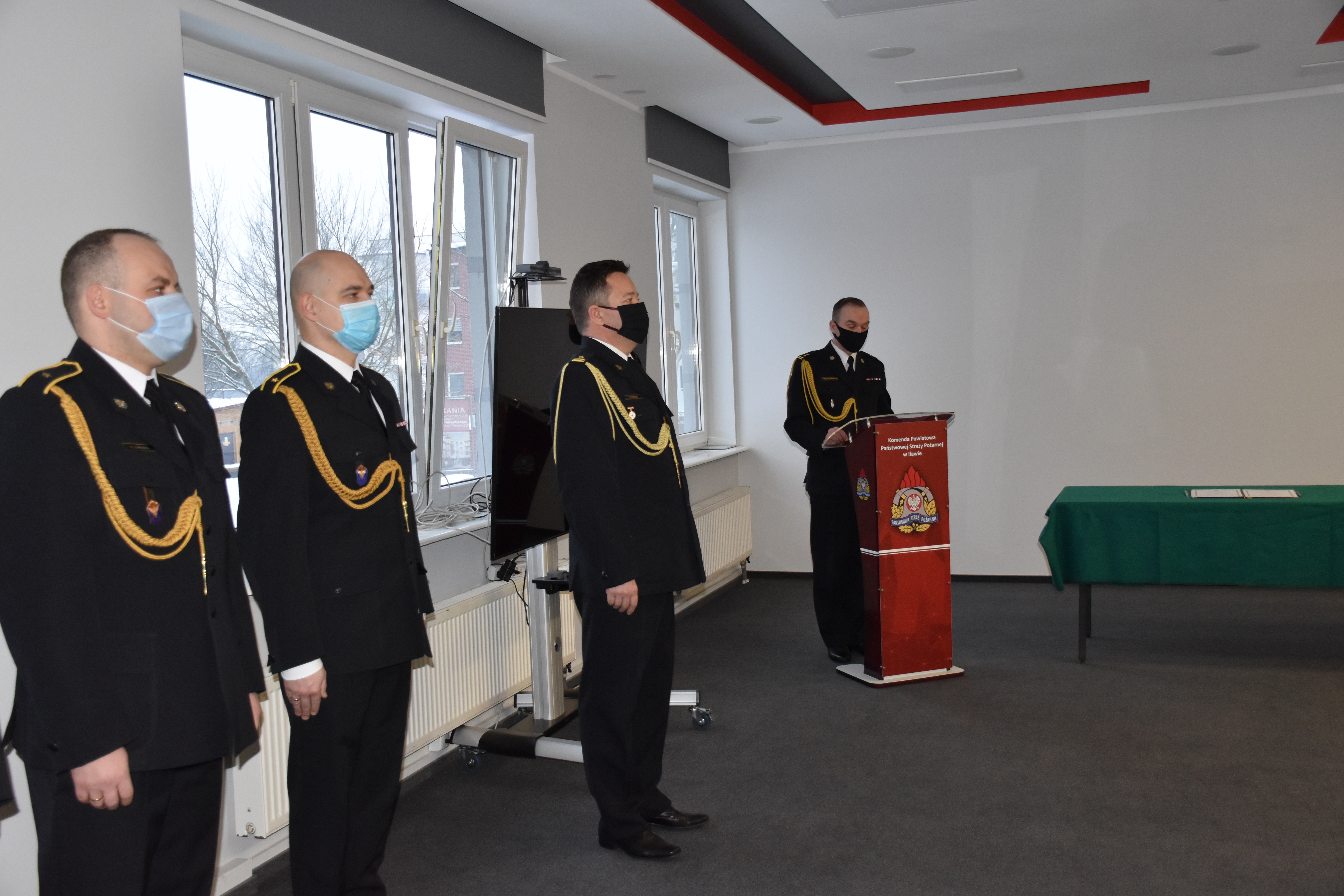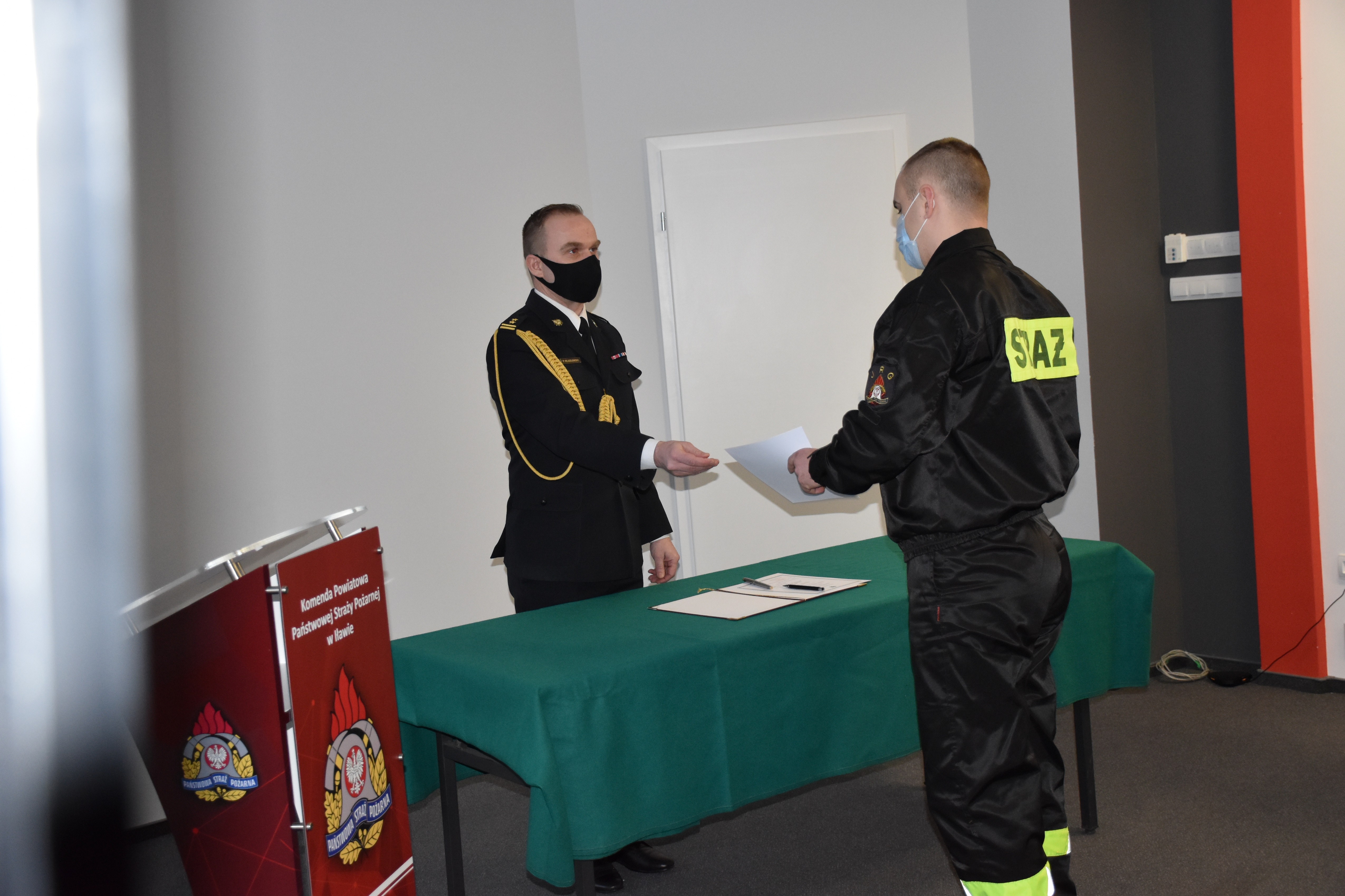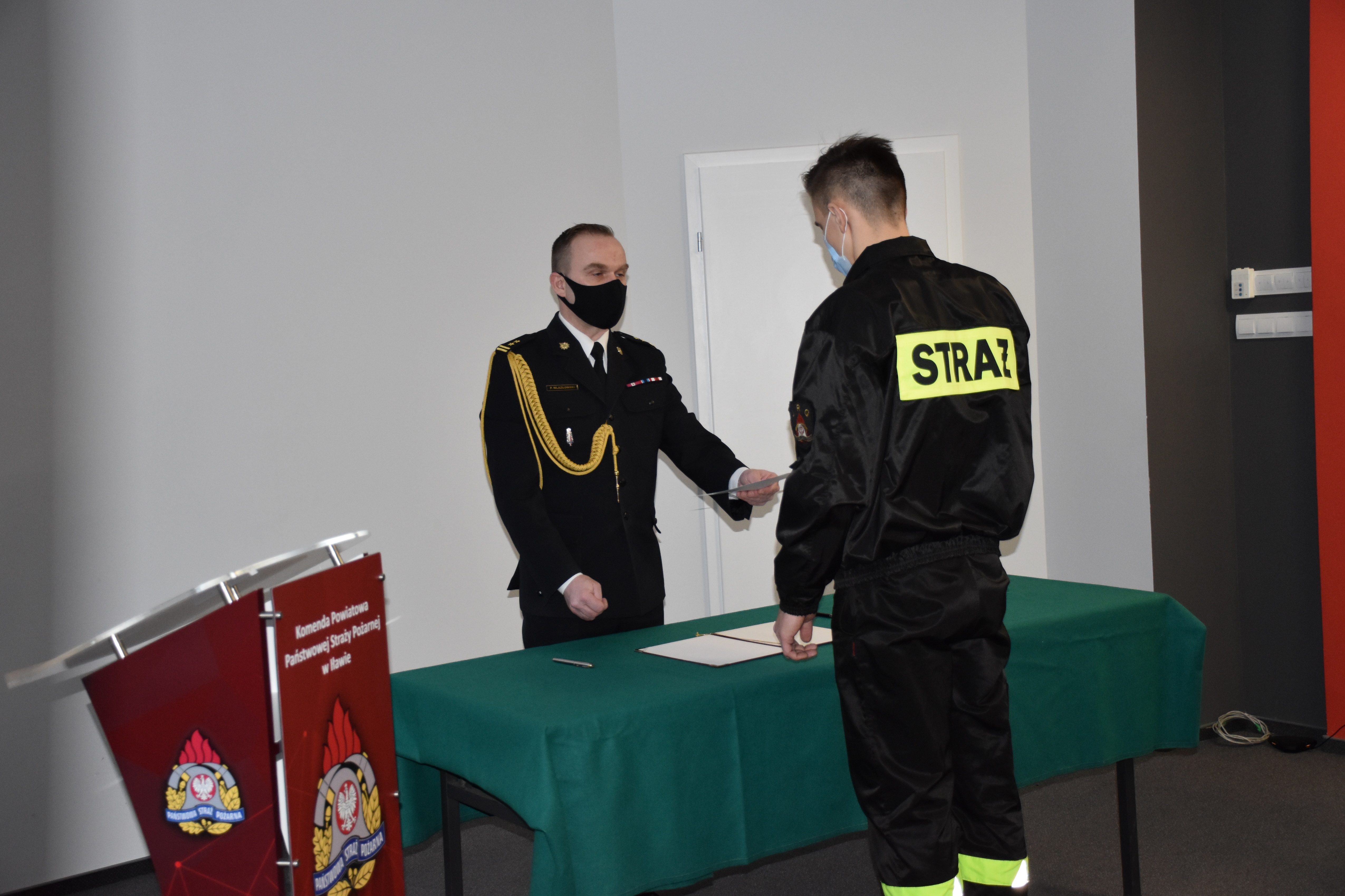 Na zakończenie uroczystości strażacy złożyli podpisy pod aktami ślubowania, stając się formalnie funkcjonariuszami Państwowej Straży Pożarnej.
