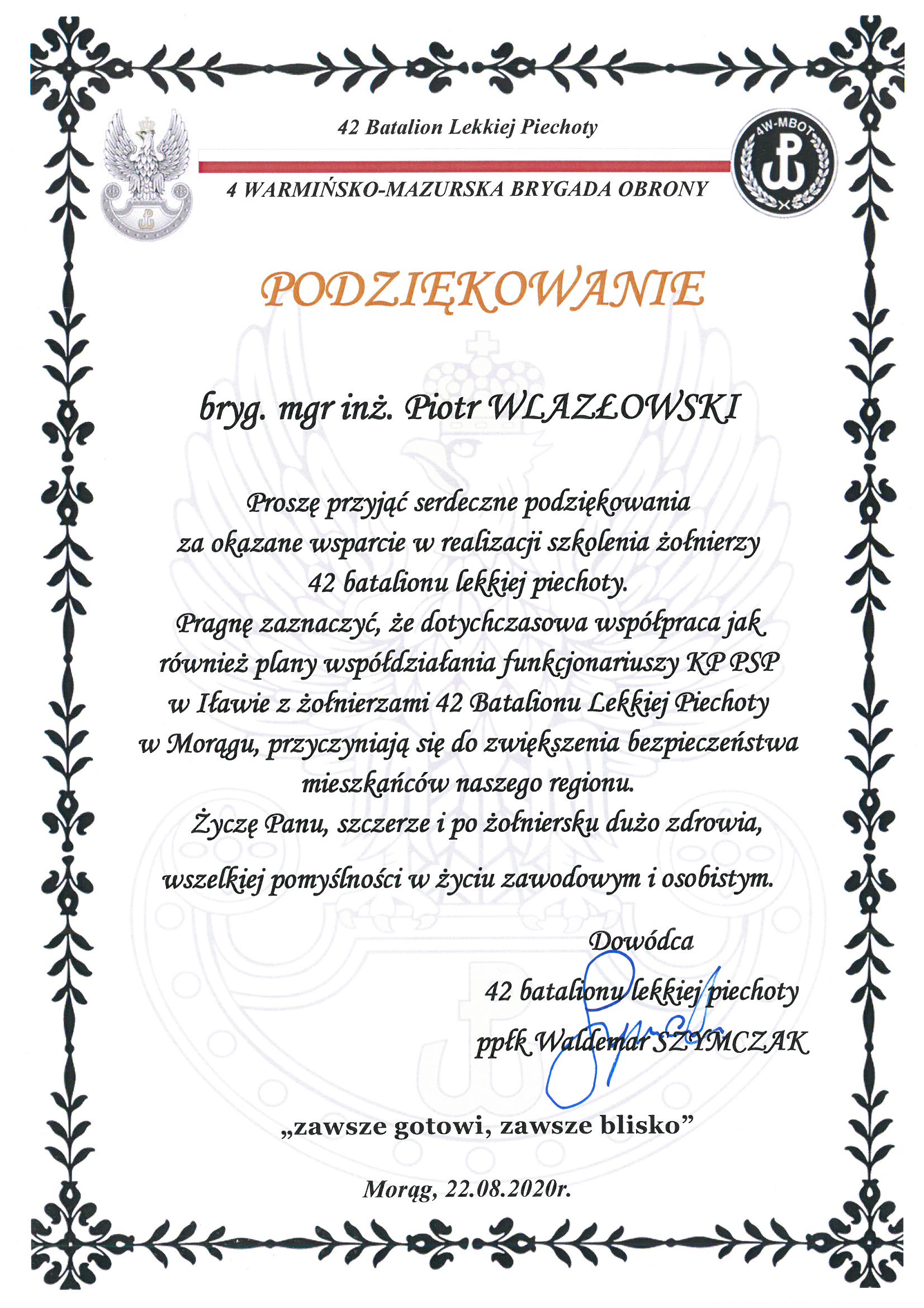 22 sierpnia na terenie poligonu w Morągu odbyły się wspólne ćwiczenia Wojsk Obrony Terytorialnej i strażaków z Iławy oraz Ostródy z żołnierzami 42 Batalionu Lekkiej Piechoty. Głównym celem szkolenia było doskonalenie umiejętności współdziałania WOT ze strażakami w sytuacjach kryzysowych z wykorzystaniem dostępnego sprzętu i środków ochrony osobistej.