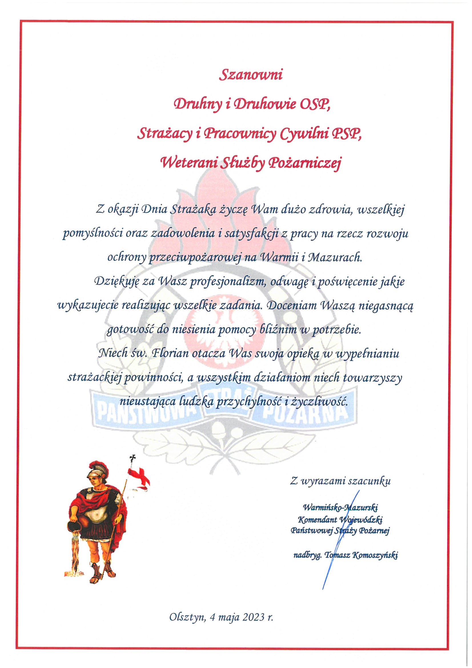 Życzenia Komendanta Wojewódzkiego PSP w Olsztynie z okazji Dnia Strażaka 04.05.2023 Zdjęcia (1) Pokaż zdjęcie 1 z galerii.