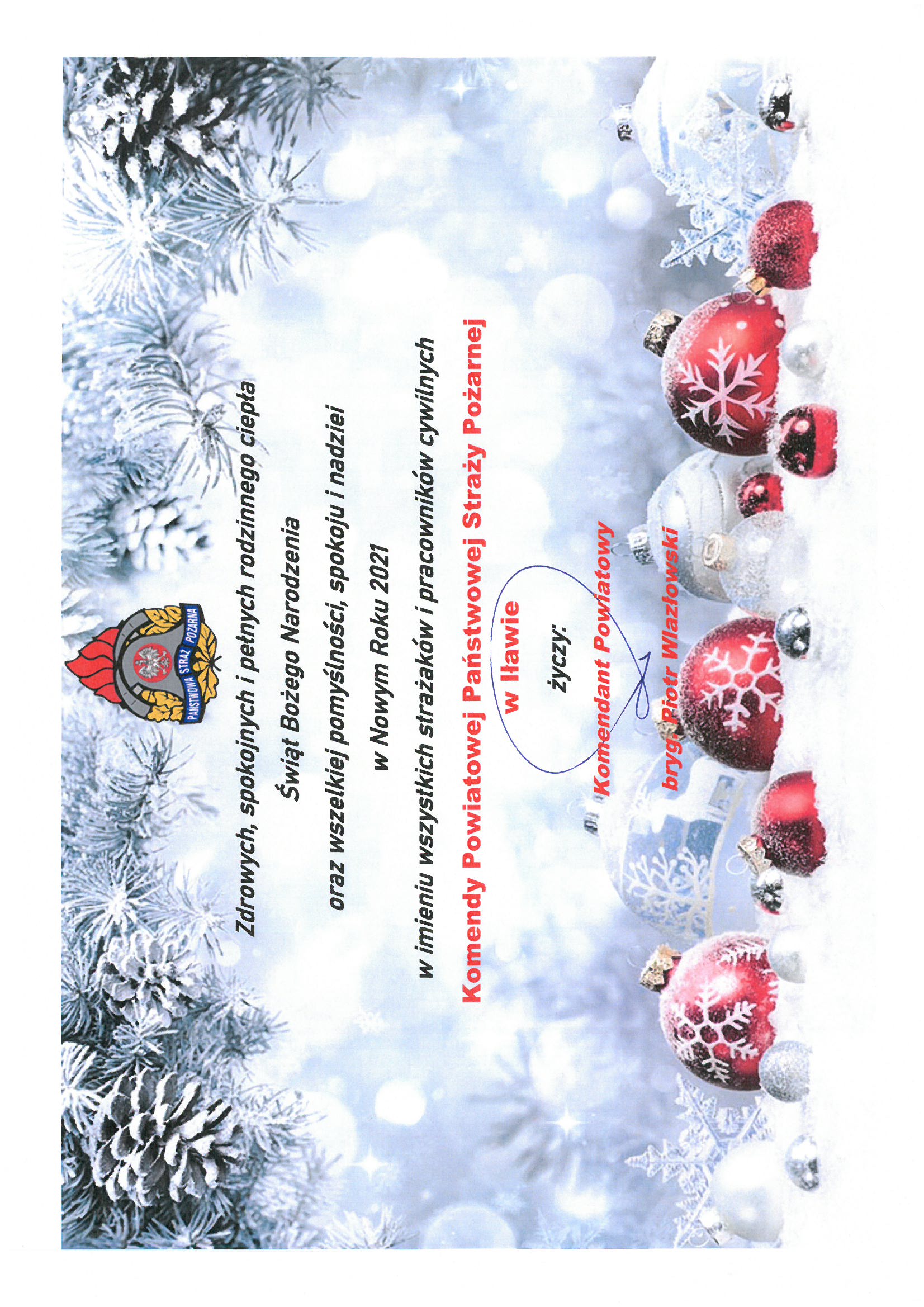 Życzenia świąteczne Komendanta Powiatowego Państwowej Straży Pożarnej w Iławie 21.12.2020 Zdjęcia (1) Pokaż zdjęcie 1 z galerii.