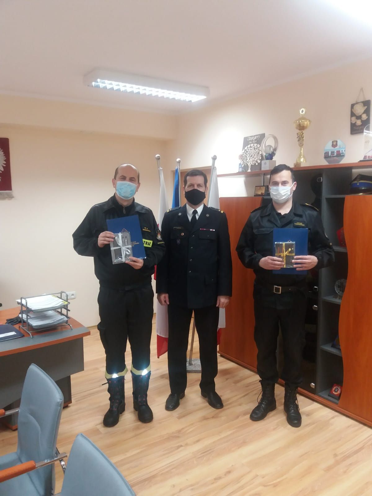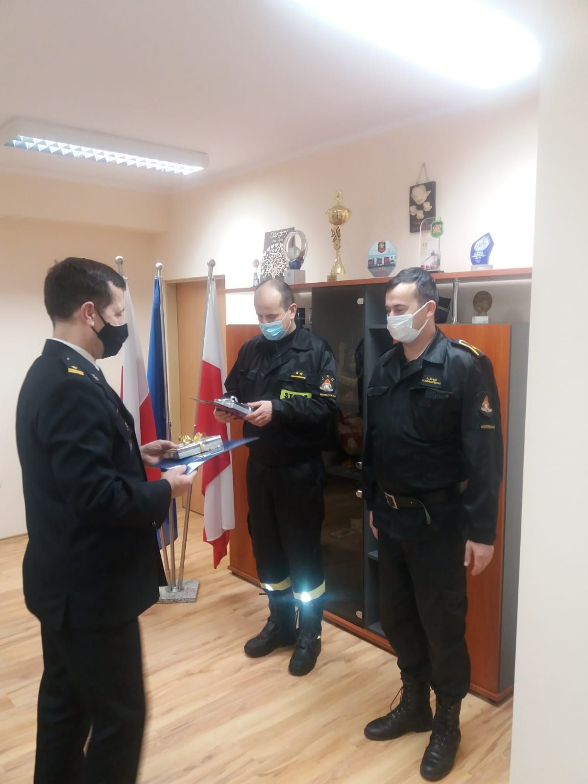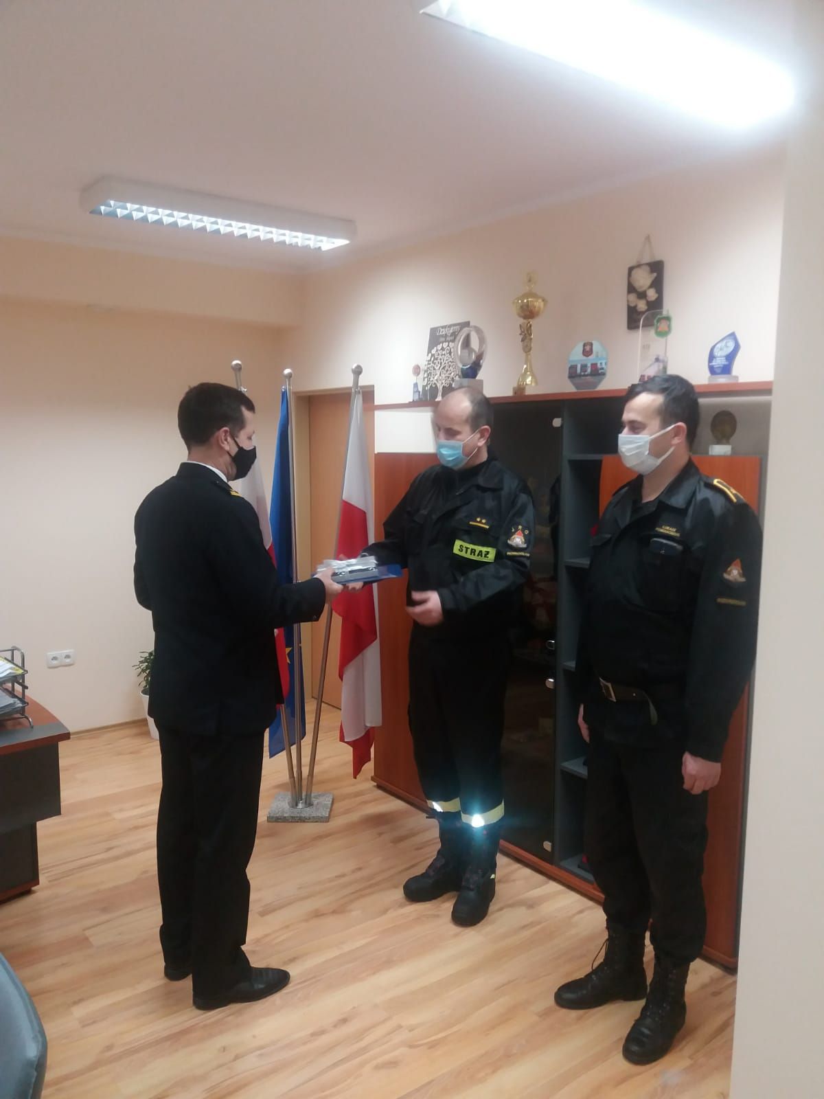 5 stycznia 2021 r. Zastępca Komendanta Powiatowego Państwowej Straży Pożarnej w Inowrocławiu - mł. bryg. Ireneusz Taraszka w imieniu kadry kierowniczej, strażaków oraz pracowników cywilnych komendy wręczył nagrody jubileuszowe i złożył serdeczne podziękowania mł. kpt. Arturowi Kaczmarkowi za 25 lat oraz asp. Łukaszowi Pomianowskiemu za 20 lat nienagannej pracy i służby.