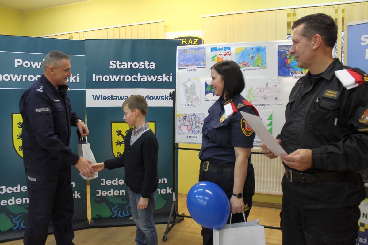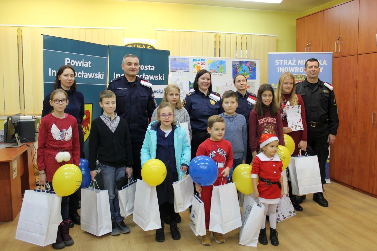 We wtorek (06.12.22) w siedzibie strażników miejskich zostały wręczone nagrody. Dzieci wynagradzali Komendant Powiatowy Policji w Inowrocławiu mł. insp. Karol Konopacki, Zastępca Komendanta Powiatowego Państwowej Straży Pożarnej w Inowrocławiu mł. bryg. Ireneusz Taraszka i Zastępca Komendanta Straży Miejskiej Sylwia Przebieracz.