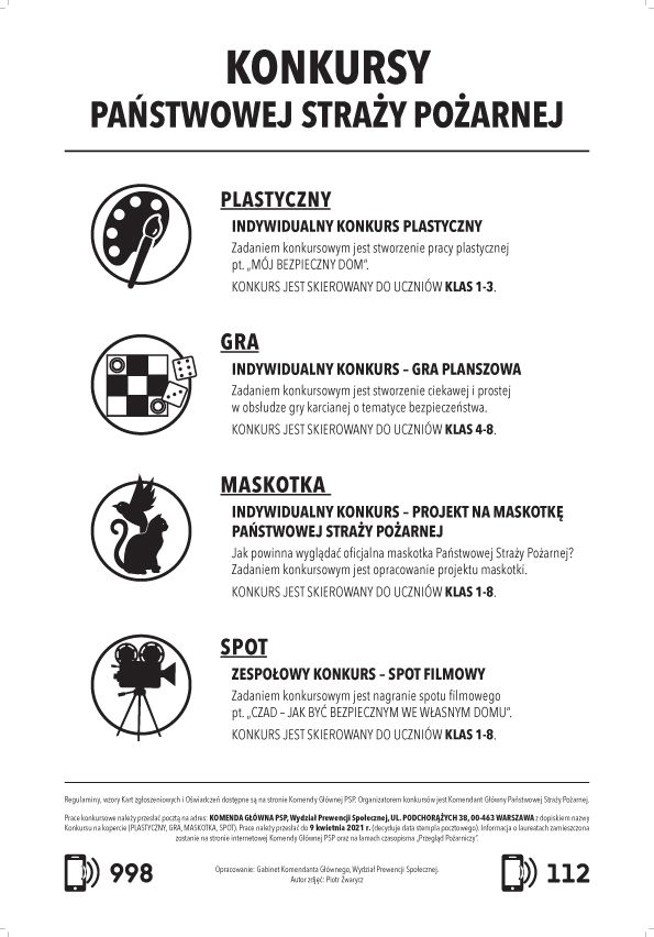 Prace konkursowe należy przesłać pocztą na adres: KOMENDA GŁÓWNA PSP, Wydział Prewencji Społecznej, UL. PODCHORĄŻYCH 38, 00-463 WARSZAWA