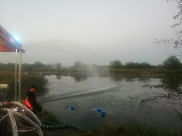 W związku z deficytem tlenowym wywołanym czynnikami atmosferycznymi, tzw. „przyducha” w zbiorniku wodnym „Kozłówka”, Państwowa Straż Pożarna w Inowrocławiu podjęła działania zmierzające do napowietrzania wody przy użyciu sprzętu pożarniczego w postaci pompy wysokiej wydajności oraz działek wodnych.