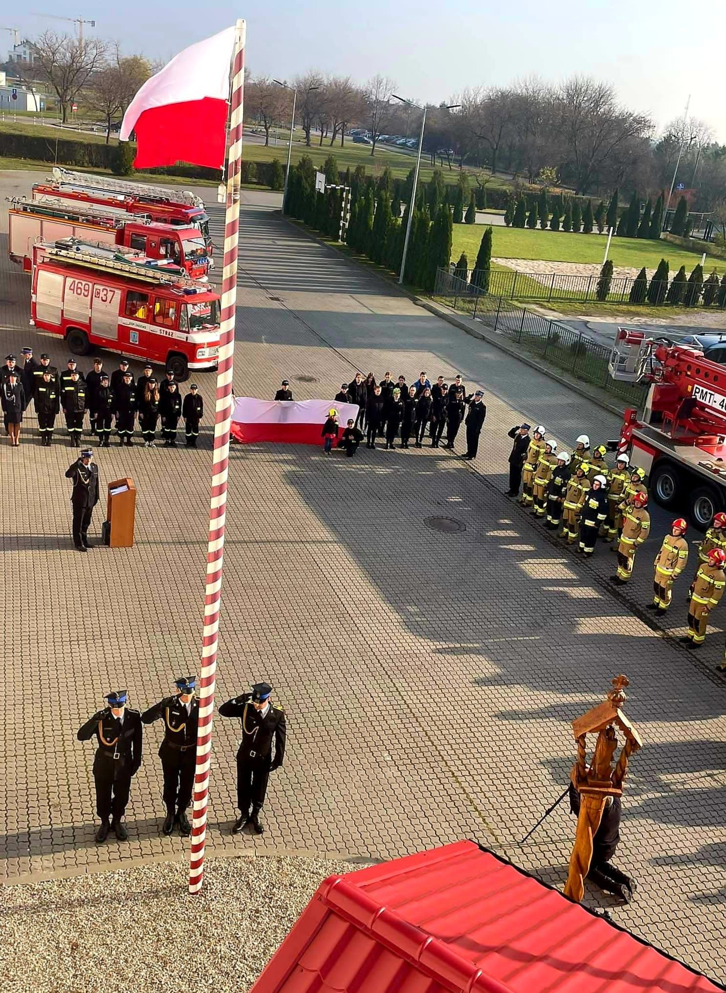Funkcjonariusze z KP PSP w Inowrocławiu czynnie włączyli się w obchody Narodowego Święta Niepodległości. 11 listopada o godzinie 12.00 na placu przed budynkiem komendy wspólnie z druhami OSP Gąski, Jacewo, MDP Rojewo, uczniami klas mundurowych ZSCH-E oraz mieszkańcami Powiatu Inowrocławskiego odśpiewali Mazurka Dąbrowskiego. Uroczysta zbiórka rozpoczęła się od powitania wszystkich uczestników przez zastępcę komendanta powiatowego PSP mł. bryg. Ireneusza Taraszkę, który podziękował za godne upamiętnienie i uczczenie 103 rocznicy odzyskania niepodległości przez państwo polskie oraz odczytał listy Prezesa Rady Ministrów i Kierownictwa Komendy Głównej PSP z okazji Narodowego Święta Niepodległości.