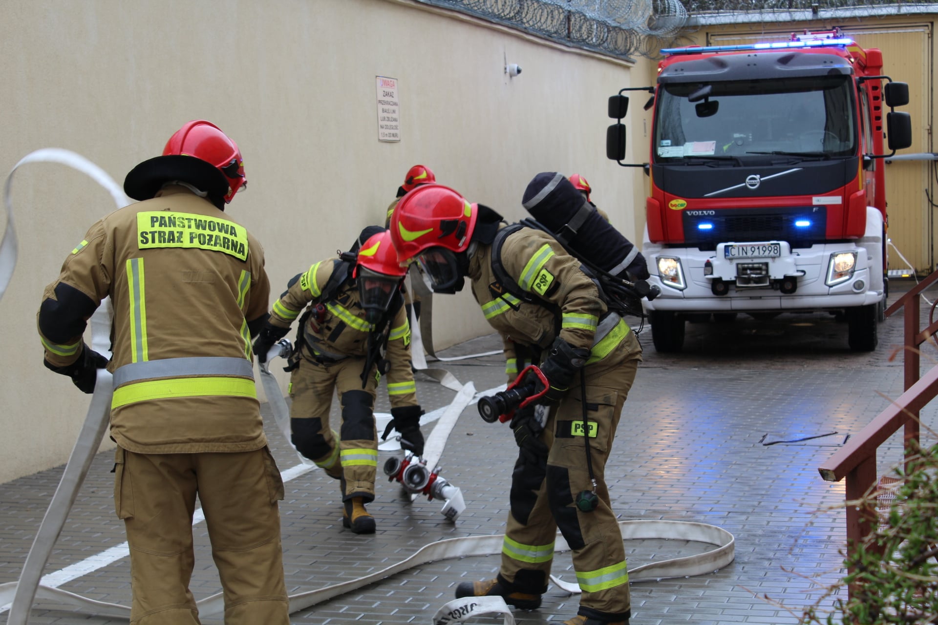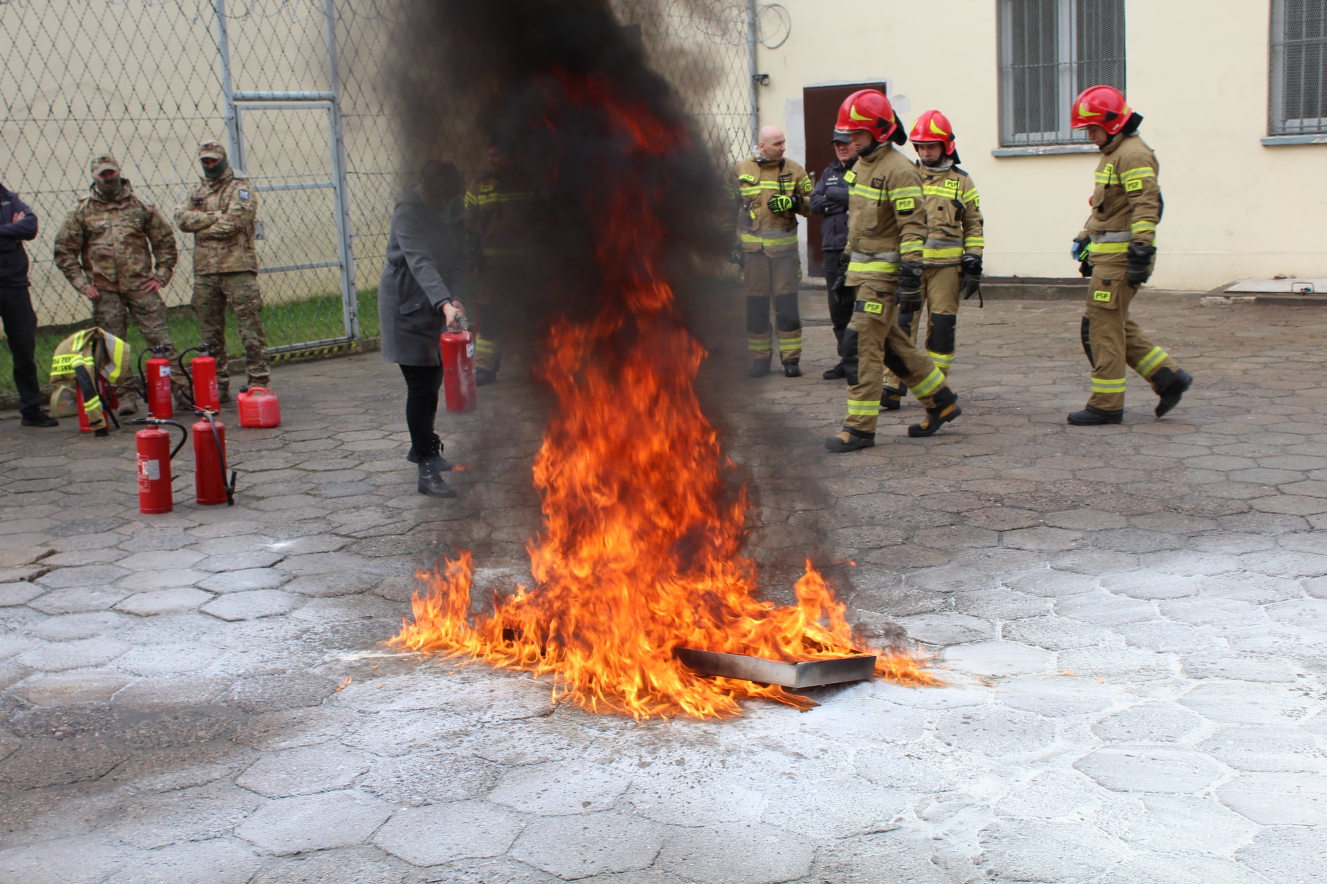 Na miejscu obecni byli: ppłk Magdalena Zwierzchowska - Dyrektor Zakładu Karnego w Inowrocławiu, kpt. Krzysztof Koczorowski - Zastępca Dyrektora Zakładu Karnego w Inowrocławiu, przedstawiciele Policji – mł. insp. Maciej Estkowski – zastępca Komendanta Powiatowego Policji w Inowrocławiu i komisarz Tomasz Kubiak. Komendę Powiatową Państwowej Straży Pożarnej w Inowrocławiu reprezentował mł. bryg. Ireneusz Taraszka – Zastępca Komendanta Powiatowego Państwowej Straży Pożarnej w Inowrocławiu oraz mł. bryg. Krzysztof Ferensztajn – dowódca JRG nr 2. Po zakończeniu ćwiczeń, strażacy przeprowadzili krótkie szkolenie w zakresie obsługi podręcznego sprzętu gaśniczego przeznaczonego dla funkcjonariuszy służby więziennej.