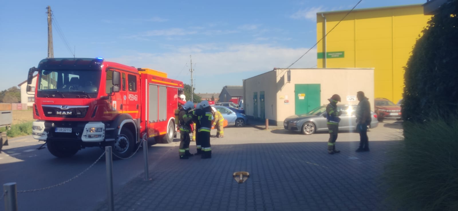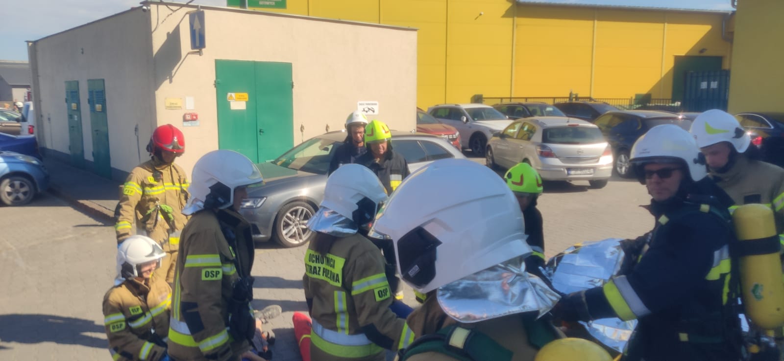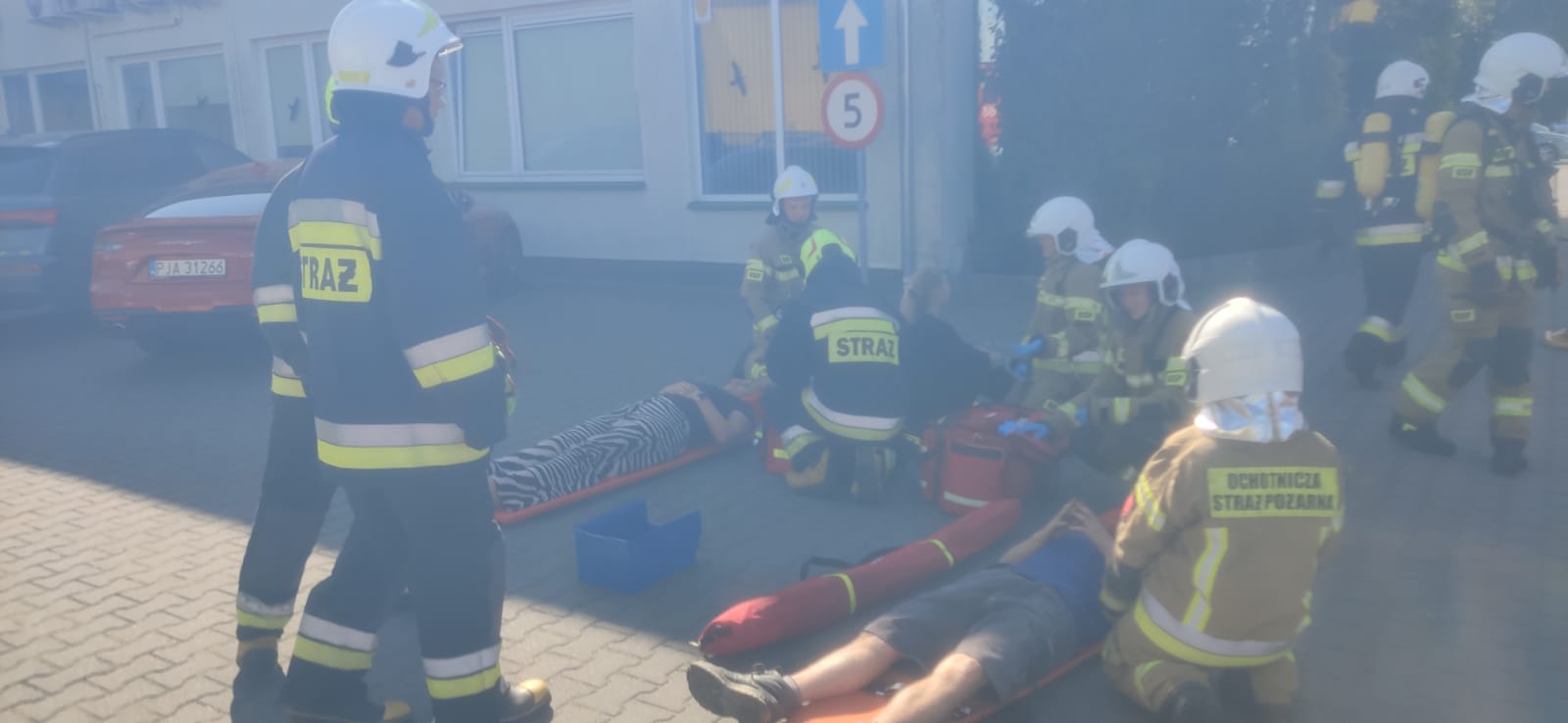 Scenariusz obejmował dwa założenia: uwolnienie osoby poszkodowanej przygniecionej przez paletę oraz wybuch pożaru na pierwszym piętrze budynku, połączony z ewakuacją pracowników.