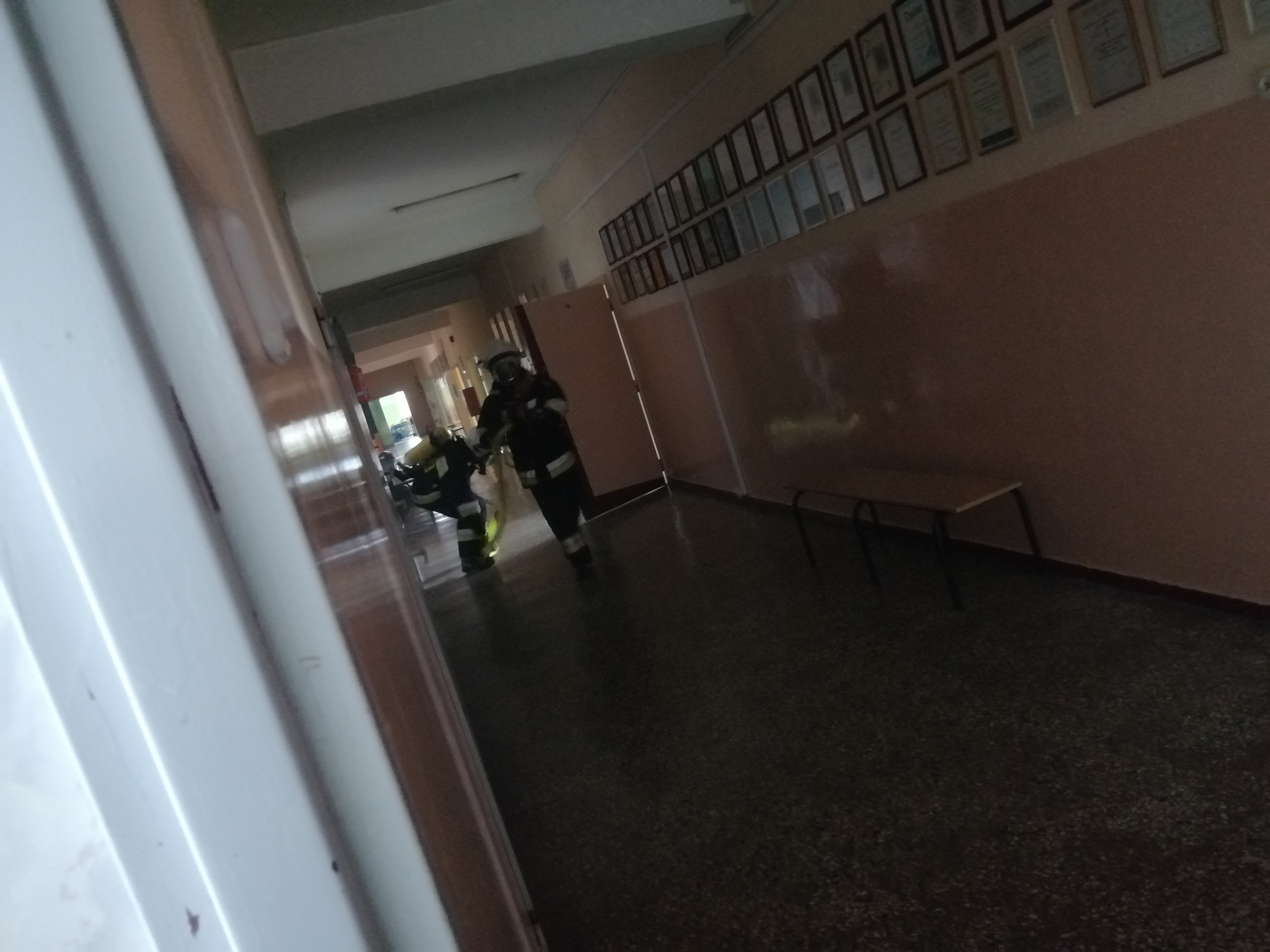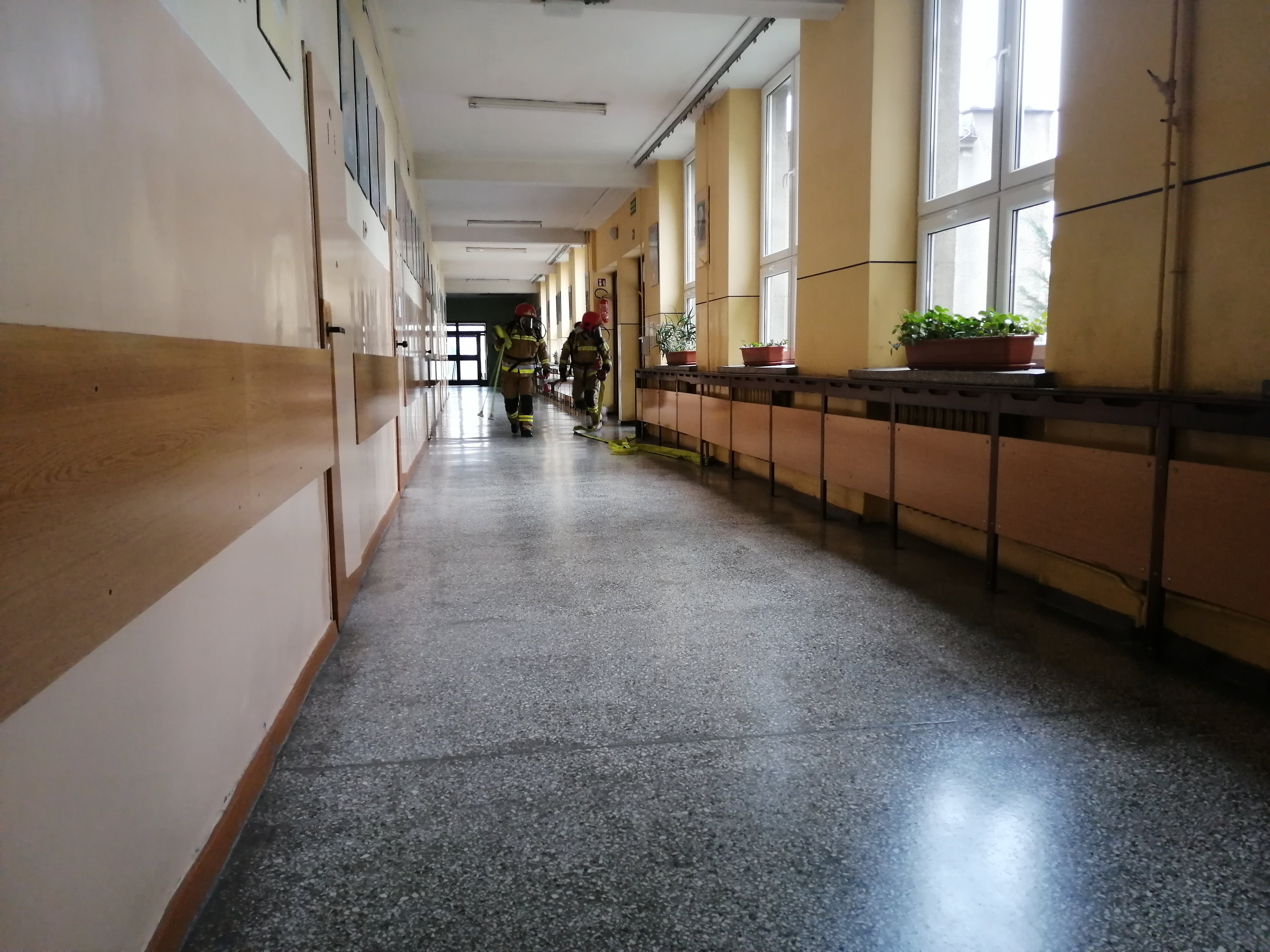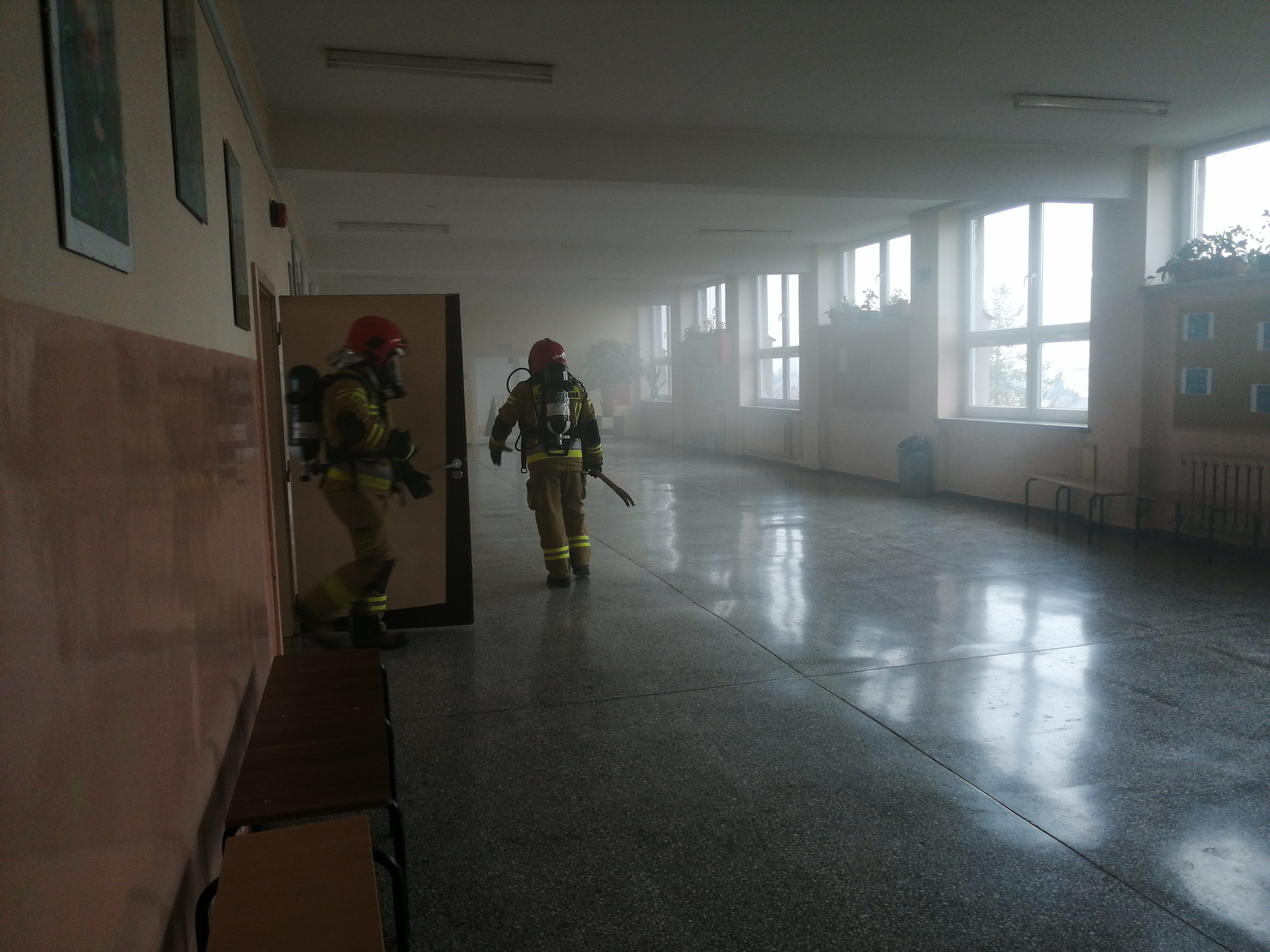 -powiadomienie służb ratowniczych o pożarze w jednej z sal lekcyjnych na drugim piętrze budynku.