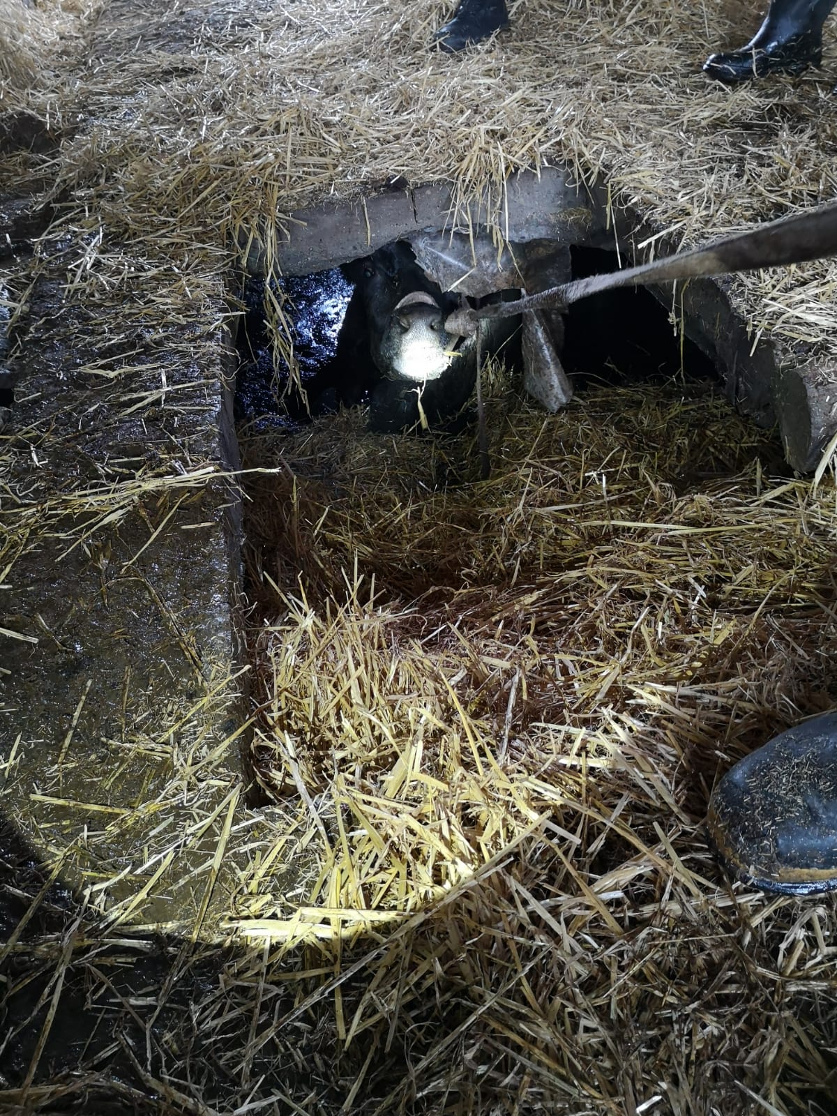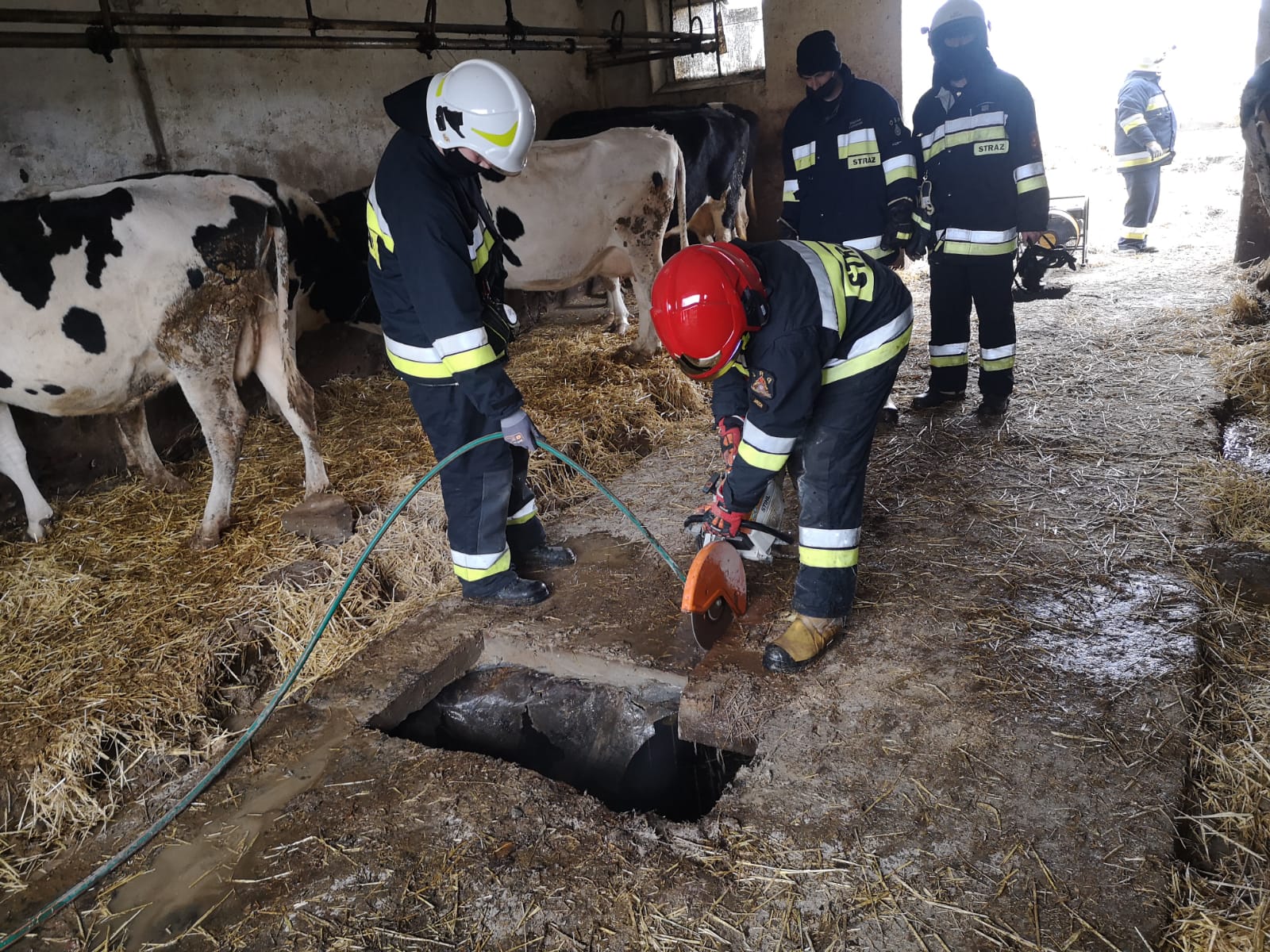 W celu wyciągnięcia krowy z szamba konieczne było powiększenie otworu przy użyciu przecinarki