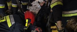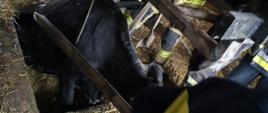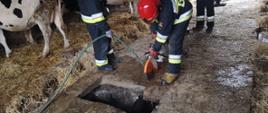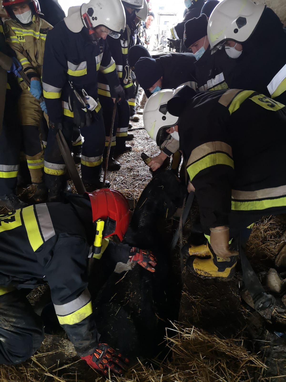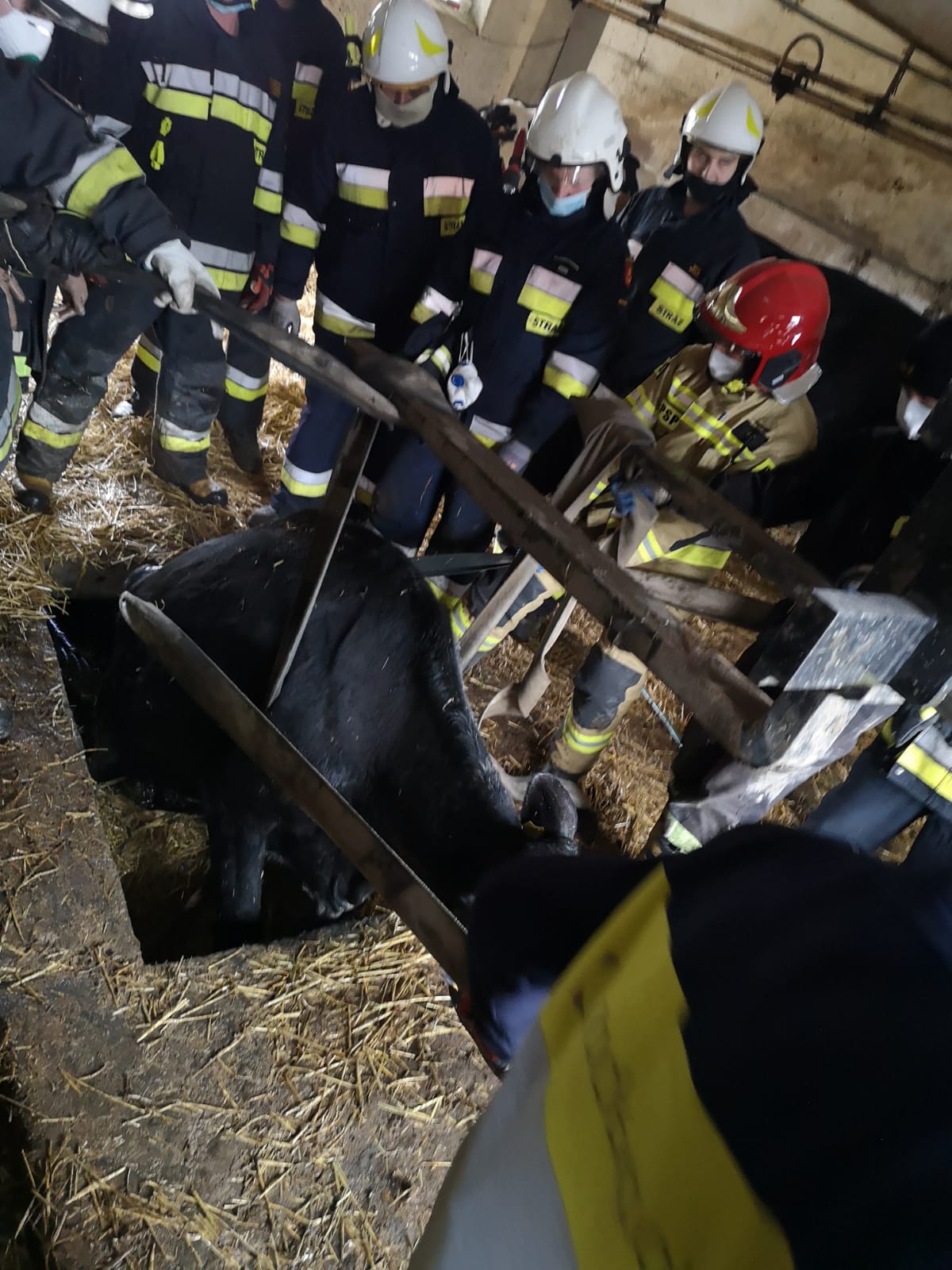 w czasie prowadzonych działań. Ratownicy przy pomocy węży W-75 i ładowarki teleskopowej wydobyli krowę z szamba. Działania ratownicze trwały blisko 3 godz.