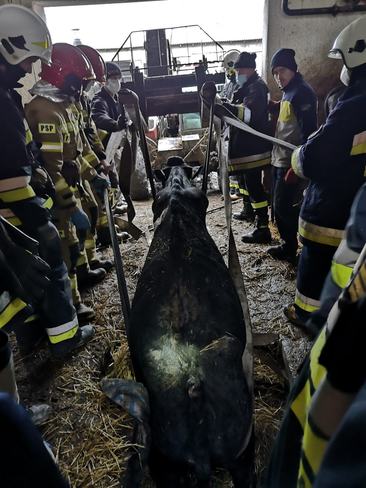 do stali i betonu. Na miejsce zdarzenia przybył również lekarz weterynarii, który przed próbą wydobycia krowy z szamba podał zwierzęciu środek uspakajający, oraz nadzorował stan krowy