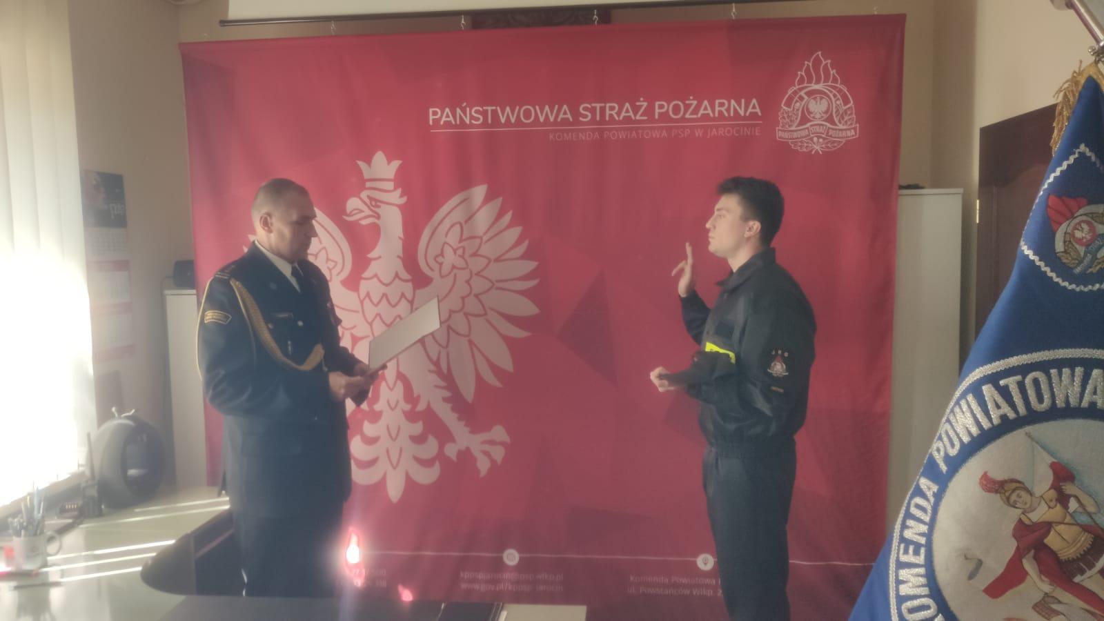 W szeregi zawodowych strażaków miał zaszczyt wstąpić strażak Maciej Wiśniewski. Ślubowanie, zgodnie z przyjętym ceremoniałem, przyjął komendant powiatowy Państwowej Straży Pożarnej w Jarocinie st. bryg. Tomasz Krawczyk. Złożenie ślubowania jest bardzo doniosłym momentem w życiu każdego strażaka, które włącza go do służby cieszącej się wysokim zaufaniem społecznym.