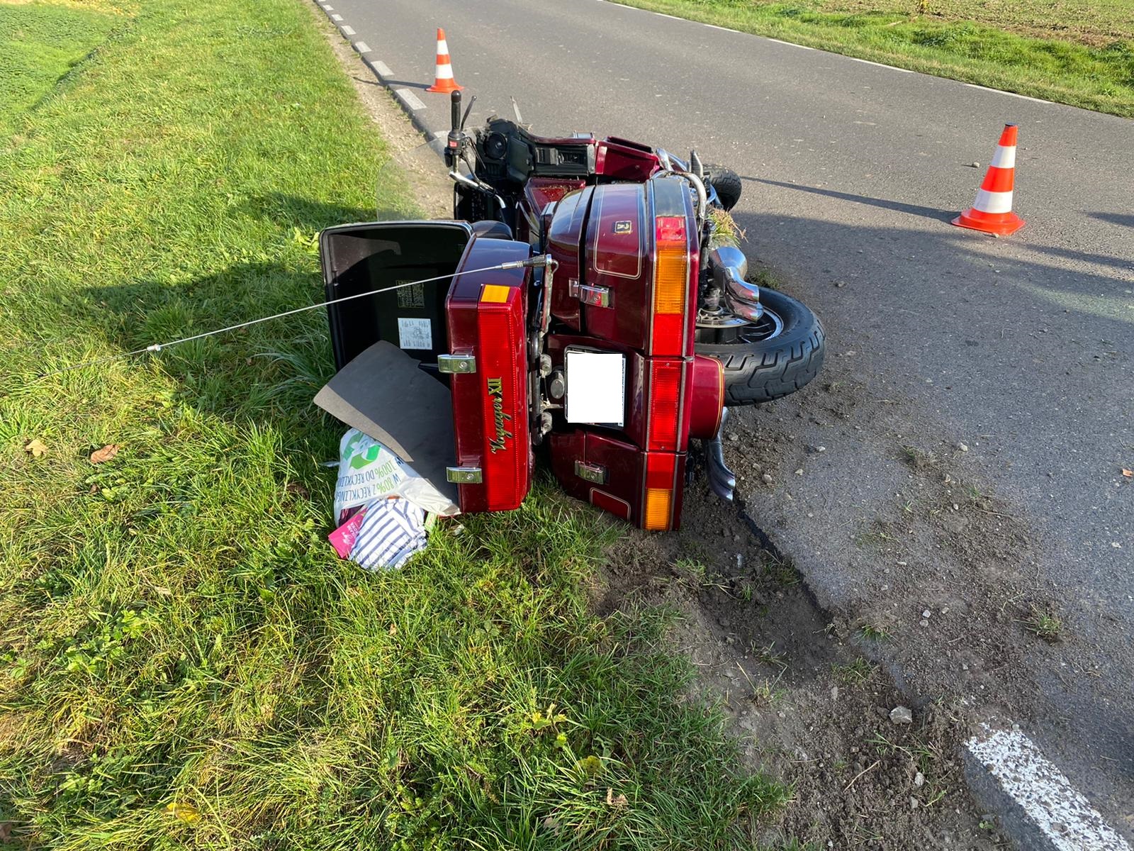 na drodze powiatowej Żerków-Śmiełów. Na miejsce zadysponowane zostały trzy zastępy straży pożarnej, jeden radiowóz oraz Zespół Ratownictwa Medycznego. Po dotarciu na miejsce zdarzenia zastano rozbity motocykl oraz kierowcę jednośladu. Działania ratowników polegały na zabezpieczeniu terenu prowadzonych działań, oraz zaopatrzeniu medycznym przez przybyłą jako pierwszą jednostkę JOP z OSP KSRG Żerków. Kierowca pojazdu został przekazany przybyłemu na miejsce zdarzenia ZRM. Wyciekłe płyny eksploatacyjne wraz