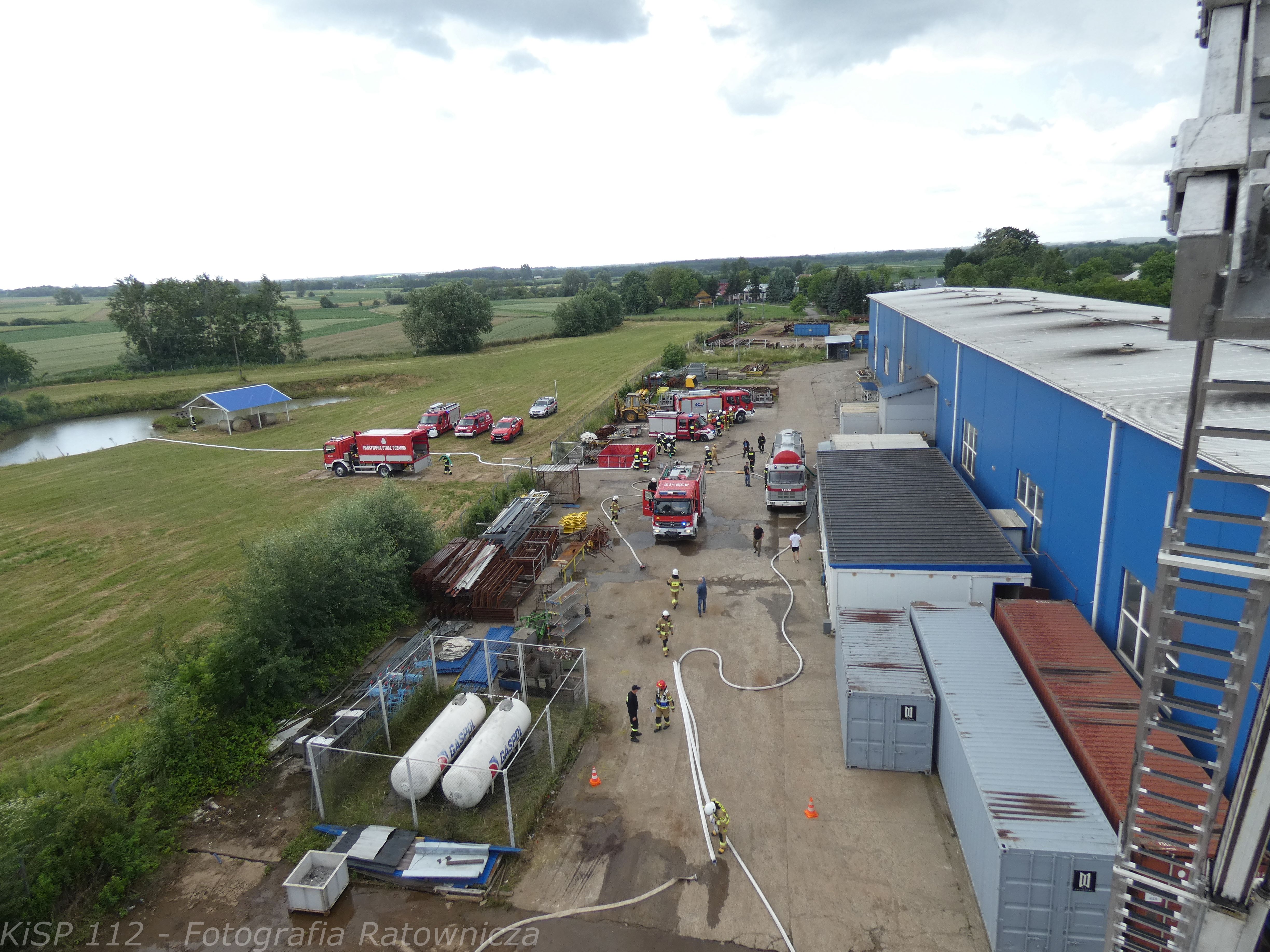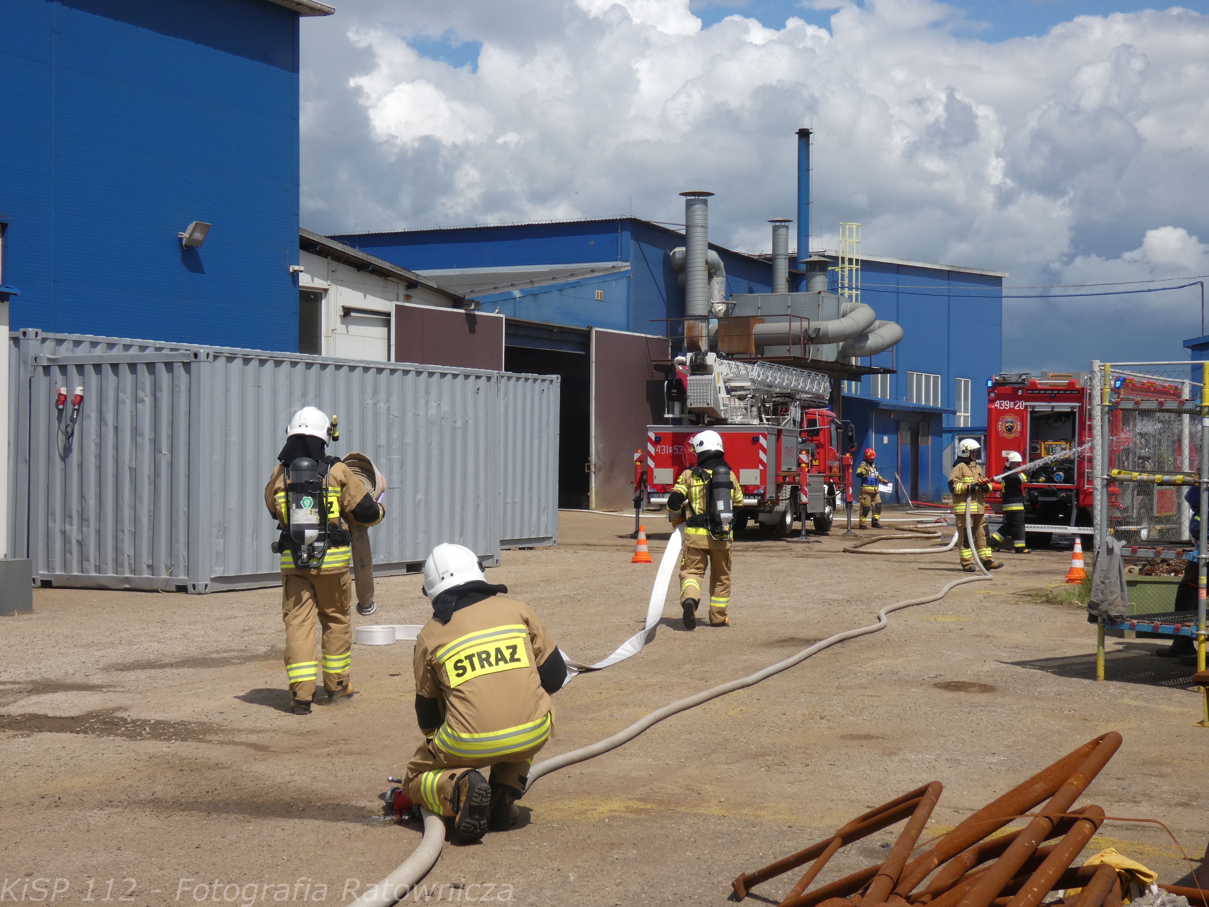 Ze względu na rodzaj działalności zaplanowano ćwiczenia w dwóch epizodach. Pierwszy z nich przewidywał powstanie pożaru w wyniku awarii kotła na paliwo stałe. Ogień z ciepłowni błyskawicznie rozprzestrzenia się na dalsze części ( hale) obiektu, jak również stanowi poważne i realne zagrożenie dla zbiorników z propanem butanem.