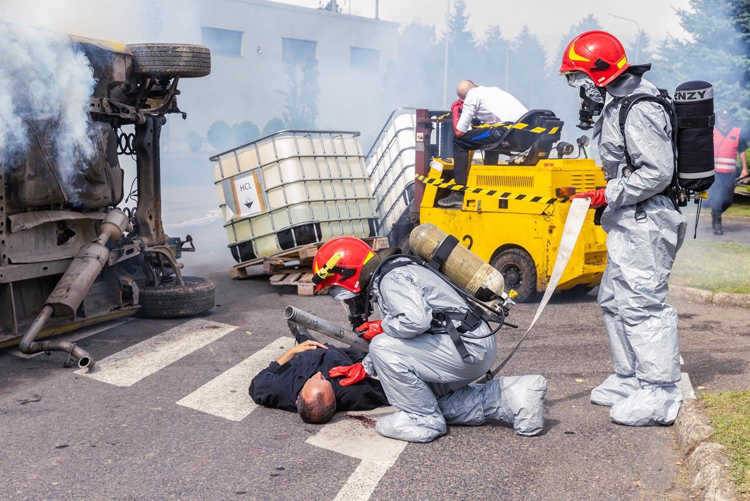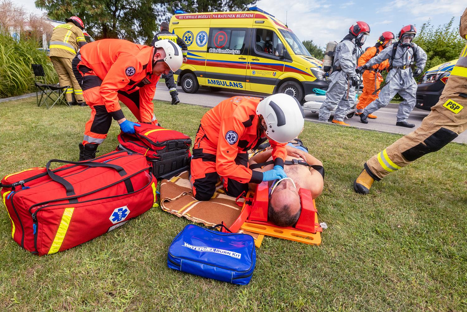 Pierwszy z nich to udzielenie pomocy pracownikowi, który uległ wypadkowi wykonując czynności serwisowe na wysokości. W scenariusz tego epizodu wpisana była również awaria chemiczna. Mianowicie w wózek widłowy transportujący zbiornik z kwasem solnym uderza samochód przewożący pięciu pracowników. W wyniku zdarzenia dochodzi do uszkodzenia pojemnika i wycieku substancji niebezpiecznej na powierzchnię gruntu. Pasażerowie pojazdu ulegają licznym obrażeniom ciała. Jest to m.in. mężczyzna, który utracił przytomność, a ponadto odniósł oparzenia twarzy, dłoni i przedramion. Inny poszkodowany, który usiłował zatamować wyciek z uszkodzonego zbiornika, ma widoczne oparzenia rąk, twarzy i oczu. Skarży się ponadto, że nic nie widzi. Kolejny mocno kaszle oraz silnie łzawi itp. Te i podobne objawy wymagały od ratowników podjęcia szybkich i profesjonalnych działań z zakresu ratownictwa medycznego. Przede wszystkim konieczne było ewakuowanie poszkodowanych z miejsc, gdzie występowała strefa zagrożenia. W przypadku ustania oddechu konieczne było zastosowanie sztucznego oddychania. Ponadto trzeba było zdjąć skażoną odzież i obuwie oraz przemyć oczy i skórę bieżącą wodą. Ponieważ kwas rozpuszcza się intensywnie w wodzie, wystąpiło także zagrożenie dla środowiska naturalnego. Wszystkie te okoliczności determinowały działania ratowników. W trakcie akcji, którą kierował dowódca JRG Jarosław bryg. Waldemar Czernysz, utworzono dwa odcinki bojowe. Do działań zadysponowano strażaków jarosławskiej JRG PSP, OSP, a także Specjalistyczną Grupę Ratownictwa Chemiczno – Ekologicznego, Specjalistyczną Grupa Ratownictwa Wysokościowego, ZRM i Policję. Licznie w ćwiczeniach byli reprezentowani druhowie z OSP Duńkowice, Cieszacin Wielki, Pawłosiów oraz Zakładowa Drużyna Ratownicza.