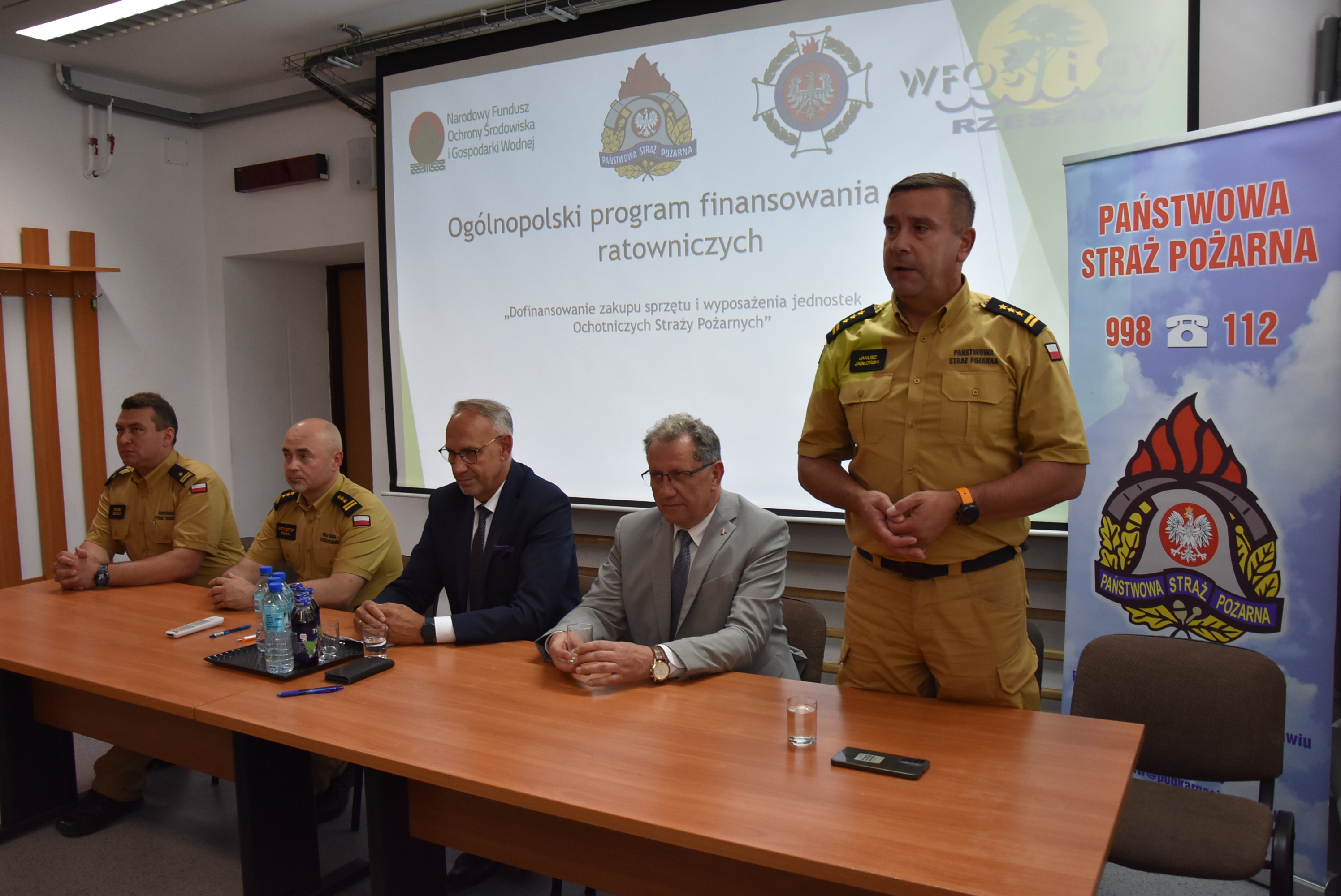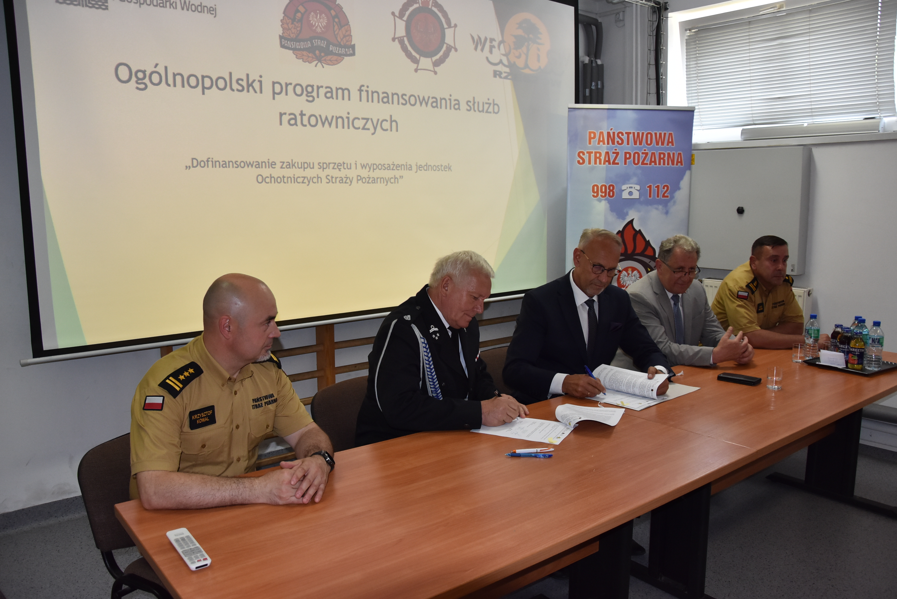 W dniu 22 czerwca 2023 roku odbyło się podpisanie i przekazanie umów na zakup sprzętu i wyposażenia dla jednostek Ochotniczych Straży Pożarnych w ramach "Ogólnopolskiego programu finansowania służb ratowniczych, Część 2) Dofinansowanie zakupu sprzętu i wyposażenia jednostek Ochotniczych Straży Pożarnych-2023rok" z udziałem środków udostępnionych przez Wojewódzki Fundusz Ochrony Środowiska i Gospodarki Wodnej w Rzeszowie.