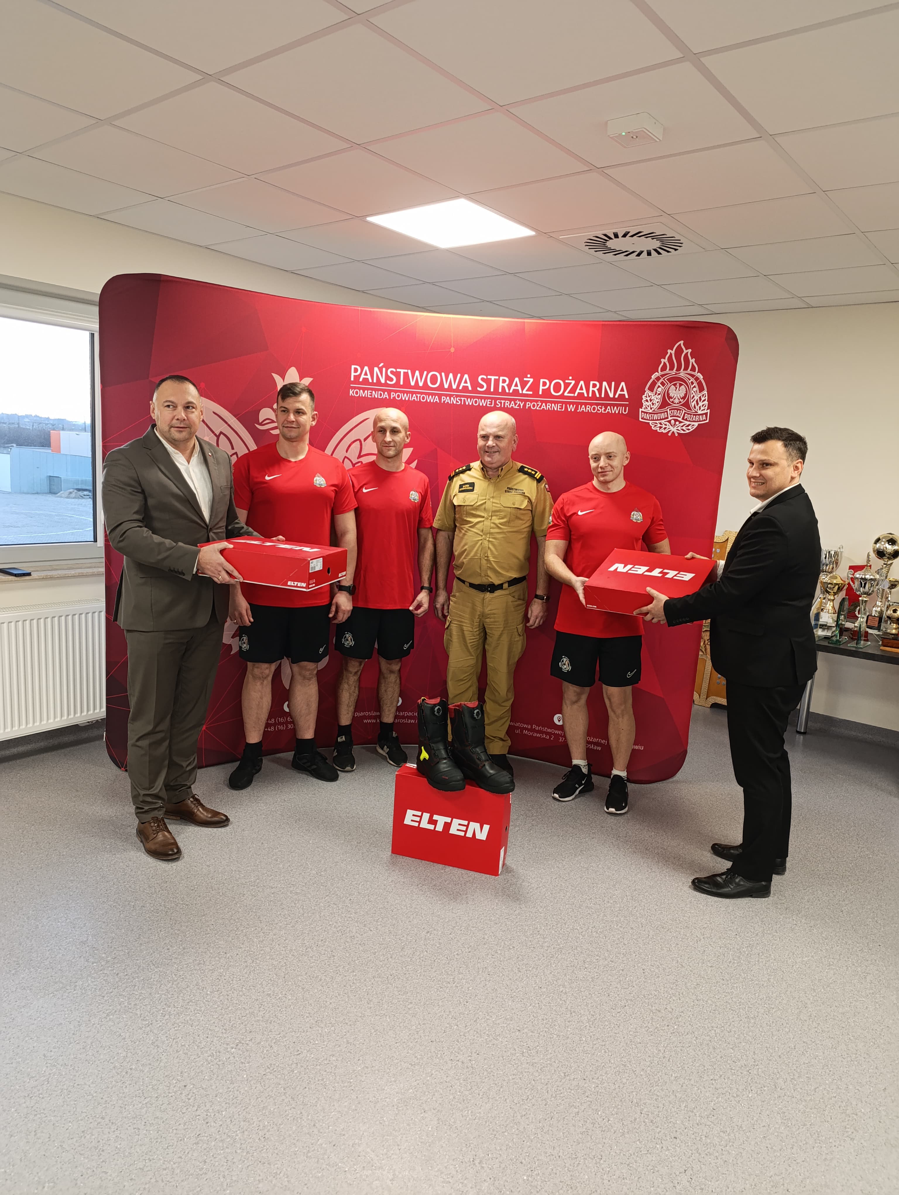W dniu 26.11.2024 r. w sali konferencyjnej Komendy Powiatowej PSP w Jarosławiu nastąpiło wręczenie na ręcę Komendanta Powiatowego PSP w Jarosławiu st. bryg. Marka Ochenduszka strojów sportowych. Starosta Jarosławski Pan Kamil Dziukiewicz oraz Burmistrz Miasta Jarosławia Pan Marcin Nazarewicz zakupili 10 kompletów strojów sportowych, tj. koszulka, spodenki, obuwie sportowe dla funkcjonariuszy, którzy reprezentują naszą Komendę w zawodach sportowych, w tym sporcie pożarniczym.