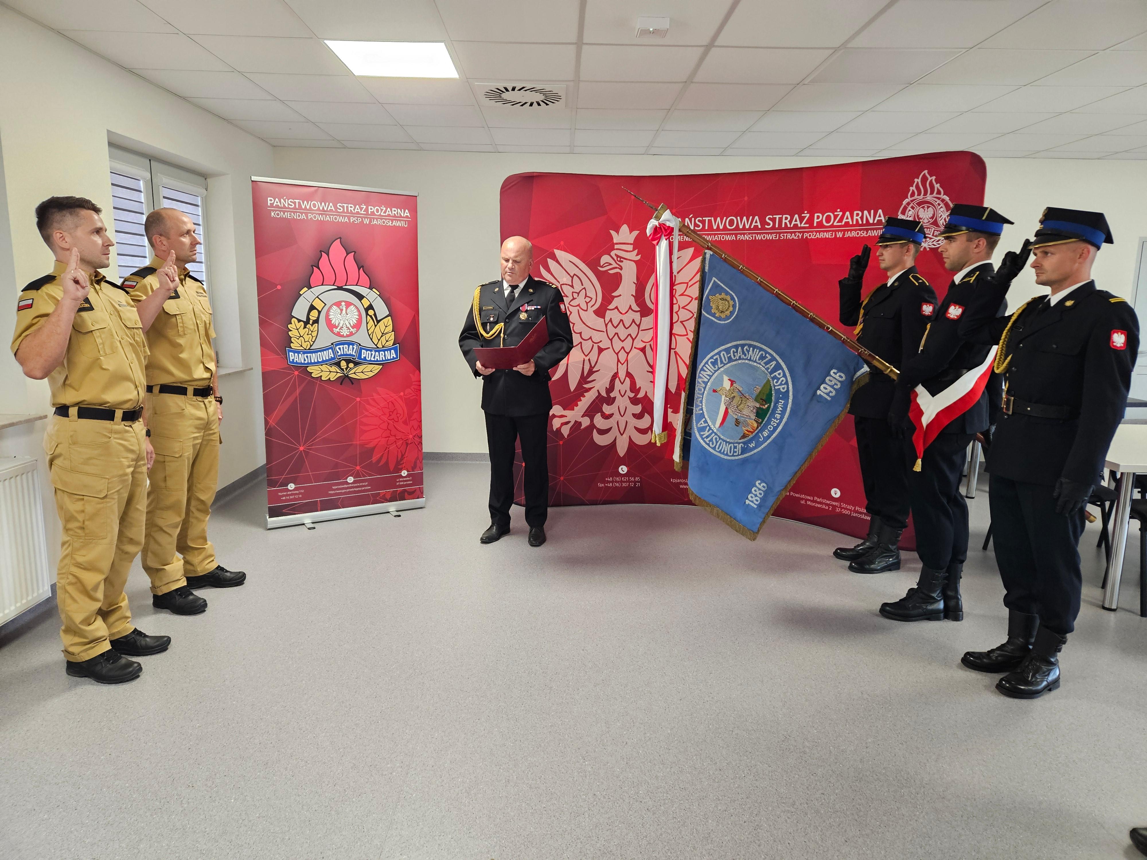 5 września 2024 roku o godzinie 13.00 w KP PSP w Jarosławiu odbyła się uroczystość złożenia ślubowania przez dwóch nowoprzyjętych strażaków, którzy poprzez ten podniosły akt powiększają jarosławską strażacką rodzinę. Ślubowanie, które w obecności kadry kierowniczej przyjął Komendant Powiatowy Państwowej Straży Pożarnej w Jarosławiu – bryg. Marek Ochenduszka zamyka ważny i niełatwy etap konkursowej rekrutacji do zawodu. Zwieńczeniem procesu naboru jest założenie munduru strażaka i uroczyste złożenie ślubowania. Ten ważny etap to jednocześnie otwarcie zawodowej drogi. Teraz przychodzi czas na szkolenia, kursy, zdobywanie specjalizacji w służbie trudnej, bywa że niebezpiecznej, ale zaszczytnej i cieszącej się niesłabnącym prestiżem w społeczeństwie.