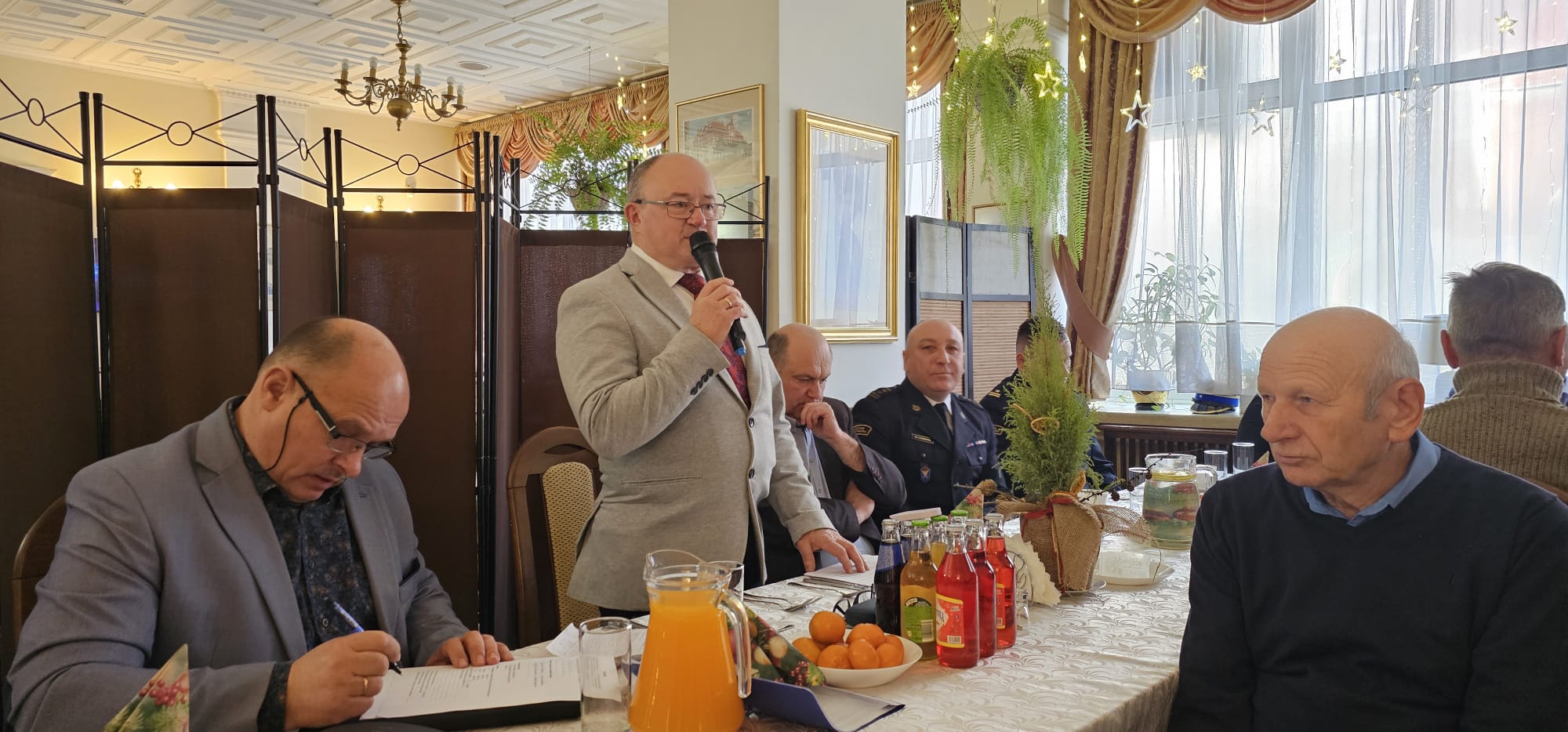Członek Zarządu OW ZEiR RP w Rzeszowie – kol. Paweł Janas przywitał wszystkich obecnych i podziekował za zaproszenie, a następnie uzupełnił najważniejsze informacje z działalności Zarządu Podkarpackiego OW ZEiR RP za II półrocze 2025r., a także Zarządu Głównego Związku oraz przedstawił plany OW Związku na 2026r. dotyczących m.in. planowwnych owanych wycieczek, tj.: w m-cu czerwcu 3-dniowej do Warszawy oraz we wrzesniu 6-dniowej do Rumuni (Transylwani). Na koniec w imieniu Prezesa OW Zwiazku oraz własnym złożył wszystkim zebranym, emerytom i rencistom, a na ręce Pana Dowódcy JRG PSP także strażakom PSP i ich bliskim, serdeczne życzenia noworoczne: zdrowia, wszelkiej pomyślności i dalszych sukcesów