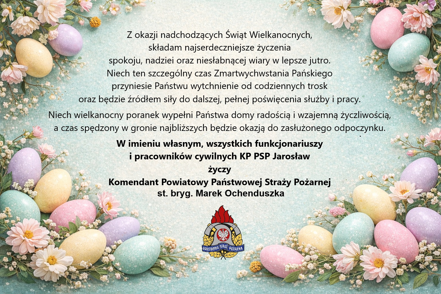 Życzenia Wielkanocne Komendanta Powiatowego PSP w Jarosławiu 02.04.2026 Zdjęcia (1) Pokaż zdjęcie 1 z galerii.