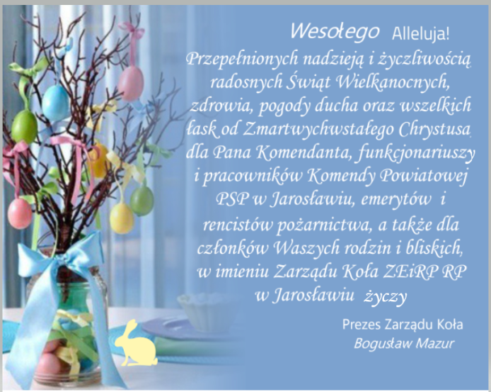 Życzenia Wielkanocne Prezesa Zarządu Koła ZEiRP RP w Jarosławiu 27.03.2024 Zdjęcia (1) Pokaż zdjęcie 1 z galerii.
