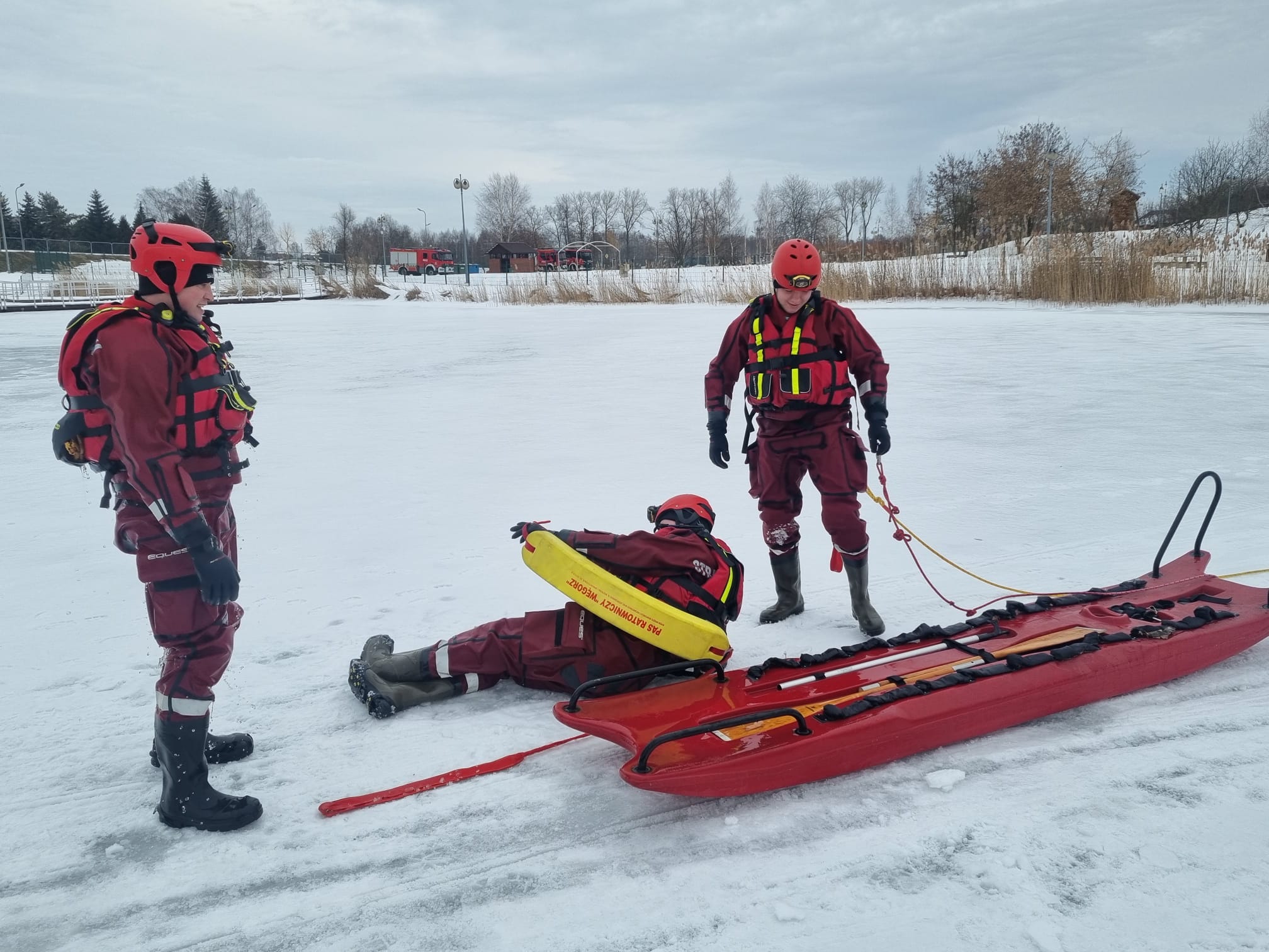 W dniach od 20 do 22 stycznia 2026 roku korzystając ze sprzyjającej pogody na terenie „Przystanek Kwiatowa” odbyło się szkolenie doskonalące z zakresu działań na lodzie, przeprowadzone dla trzech zmian służbowych z Jednostki Ratowniczo Gaśniczej KP PSP w Jaśle. W ramach zajęć teoretycznych zostały omówione zagadnienia związane z bezpieczeństwem działań ratowniczych na lodzie, samo ratownictwem, podstawowe wiadomości o parametrach lodu i wody oraz sprzętu do ratownictwa lodowego. W trakcie ćwiczeń praktycznych funkcjonariusze doskonalili techniki ewakuacji osób poszkodowanych, zasady bezpiecznej pracy ratowników, a także wykorzystanie specjalistycznego sprzętu ratowniczego.
