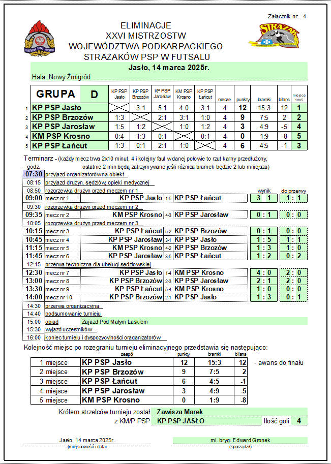 14 marca 2025 roku na hali sportowej w Nowym Żmigrodzie odbył się Turniej Eliminacyjny do XXVI Mistrzostw Województwa Podkarpackiego Strażaków PSP w Futsalu. W eliminacjach wzięło udział 5 drużyn z województwa podkarpackiego. Sędzią głównym zawodów był Marek Biros.