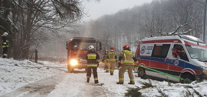 Do zdarzenia zadysponowane zostały dwa zastępy ratownicze z JRG Jawor oraz zastępy z lokalnych jednostek OSP. Okazało się, że najprawdopodobniej wskutek intensywnych opadów śniegu drzewo przewróciło się na drogę. Niestety było na tyle duże, że gałęziami upadło na sąsiednią posesję, gdzie przebywały dwie osoby dorosłe i dziecko. Pomocy medycznej poszkodowanym osobom dorosłym udzielił zespół Państwowego Ratownictwa Medycznego. Strażacy usunęli za pomocą pilarki powalone drzewo. Strażacy pozostali na miejscu do czasu odjazdu karetki. Okazało się to słuszne, ponieważ na zaśnieżonej drodze karetka zsunęła się na pobocze. Strażacy z wykorzystaniem wciągarki wyciągnęli pojazd na drogę i ten mógł kontynuować jazdę do szpitala.