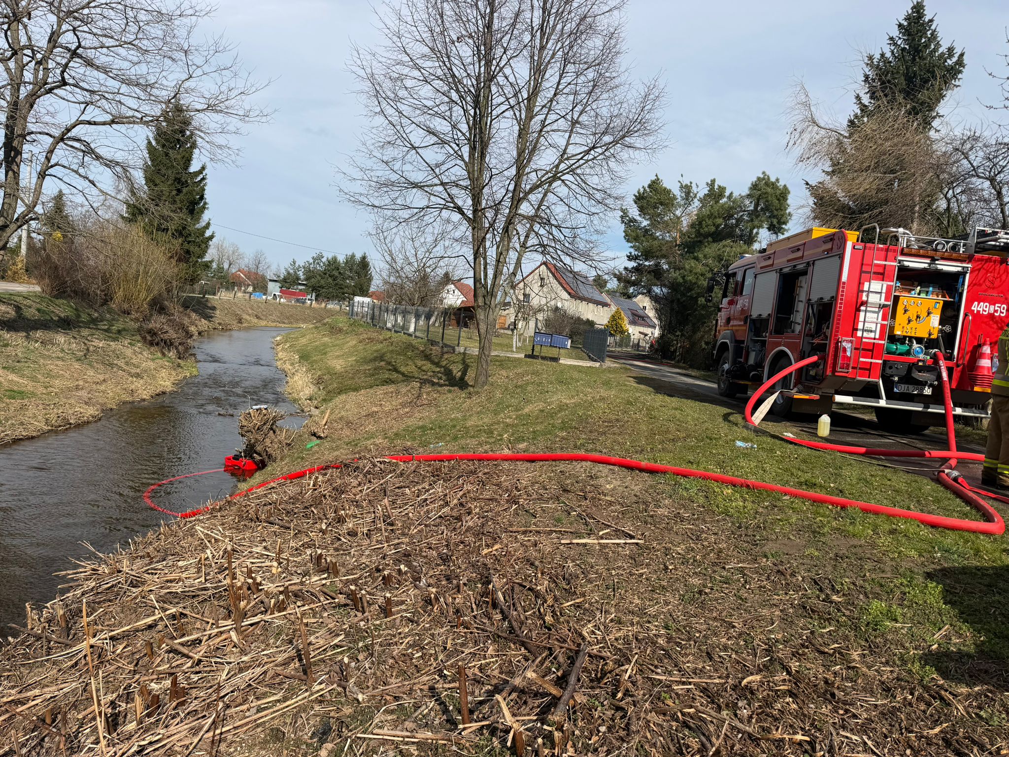Aby zapewnić ciągłość podawania środka gaśniczego, strażacy zbudowali dwa punkty czerpania wody na pobliskiej rzece i przy wykorzystaniu pomp pływających realizowali tankowania pojazdów pożarniczych. Z uwagi na rozmiar pożaru oraz dużą liczbę ratowników pracujących w aparatach ochrony dróg oddechowych na miejsce zadysponowano również przewoźną stację ładowania butli z OSP Kaczorów, która przez cały czas trwania działań na bieżąco napełniała butle powietrzem.