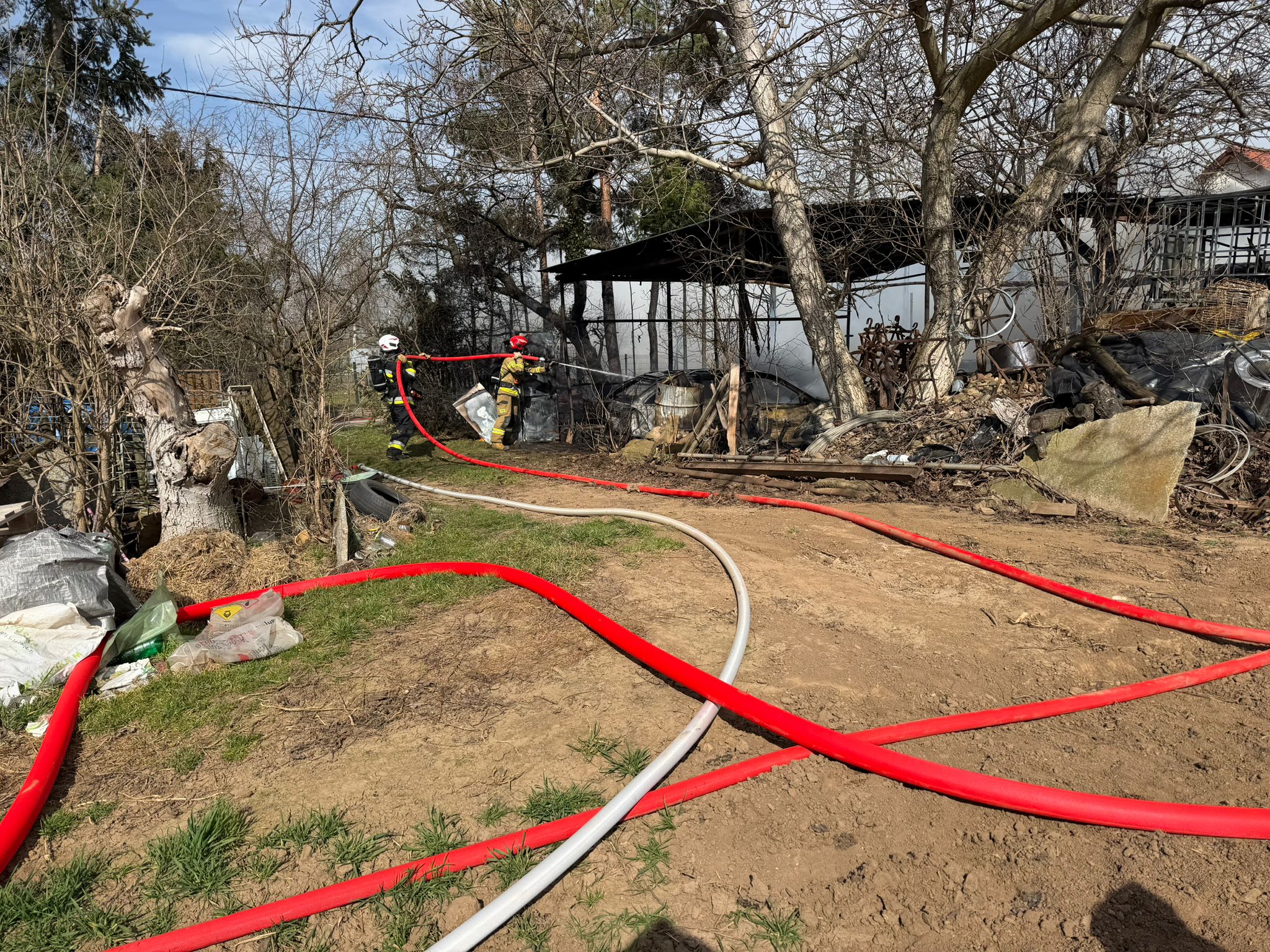 Po przyjeździe na miejsce zdarzenia kierujący działaniem ratowniczym potwierdził silnie rozwinięty pożar obejmujący budynek gospodarczy oraz wiatę gospodarczą, w której znajdowało się kilka pojazdów osobowych wraz z wyposażeniem. Pożar zagrażał przylegającemu do wiaty budynkowi mieszkalnemu oraz sąsiednim domom jednorodzinnym.