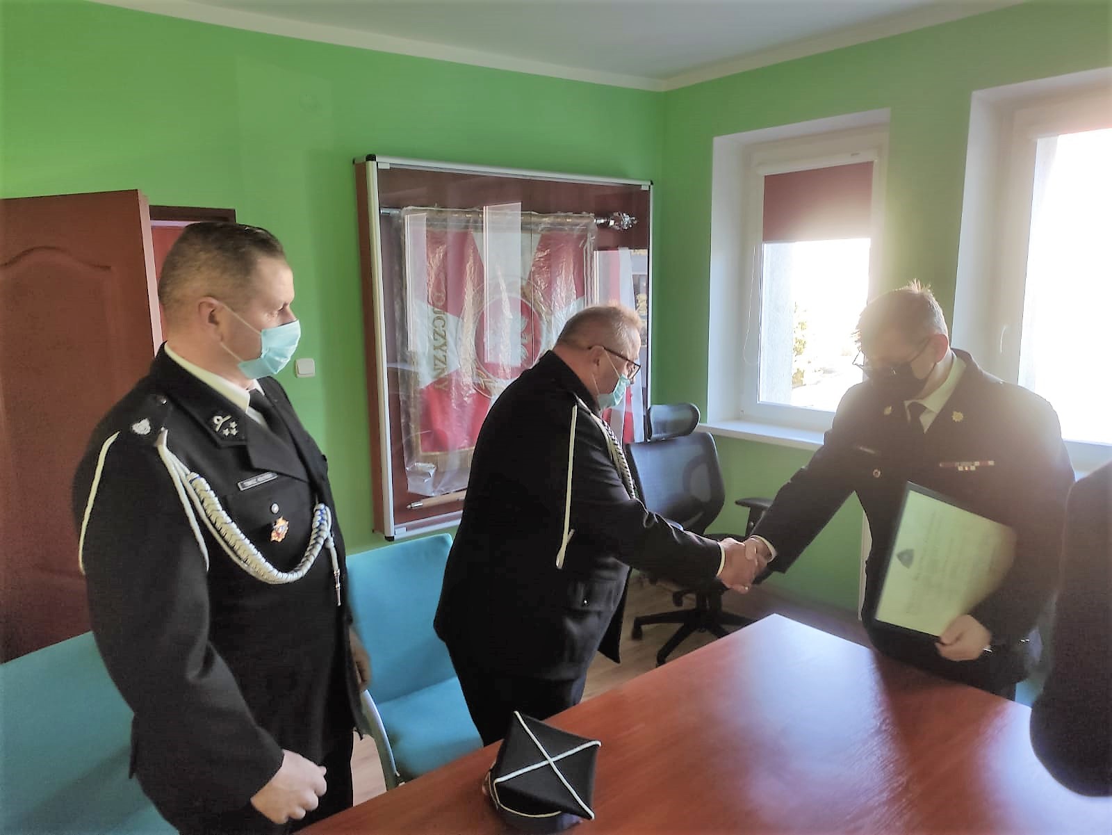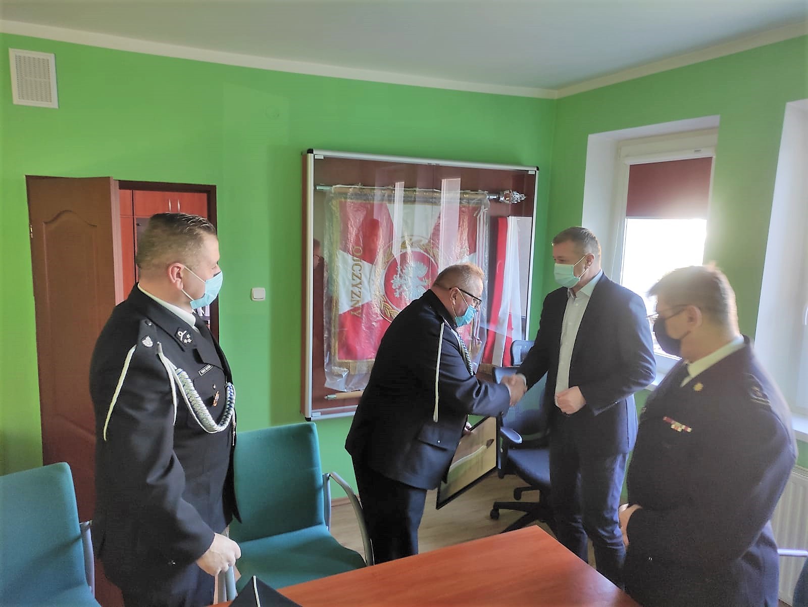 Komendant Powiatowy bryg. Waldemar Sarlej przekazał akt na ręce Prezesa OSP dh Janusza Hołyńskiego oraz Naczelnika OSP dh Tomasza Hołyńskiego. Tą skromną, z uwagi na obowiązujące obostrzenia sanitarne, uroczystość zaszczycił swoją obecnością Wójt Gminy Męcinka p. Mirosław Brzozowski.