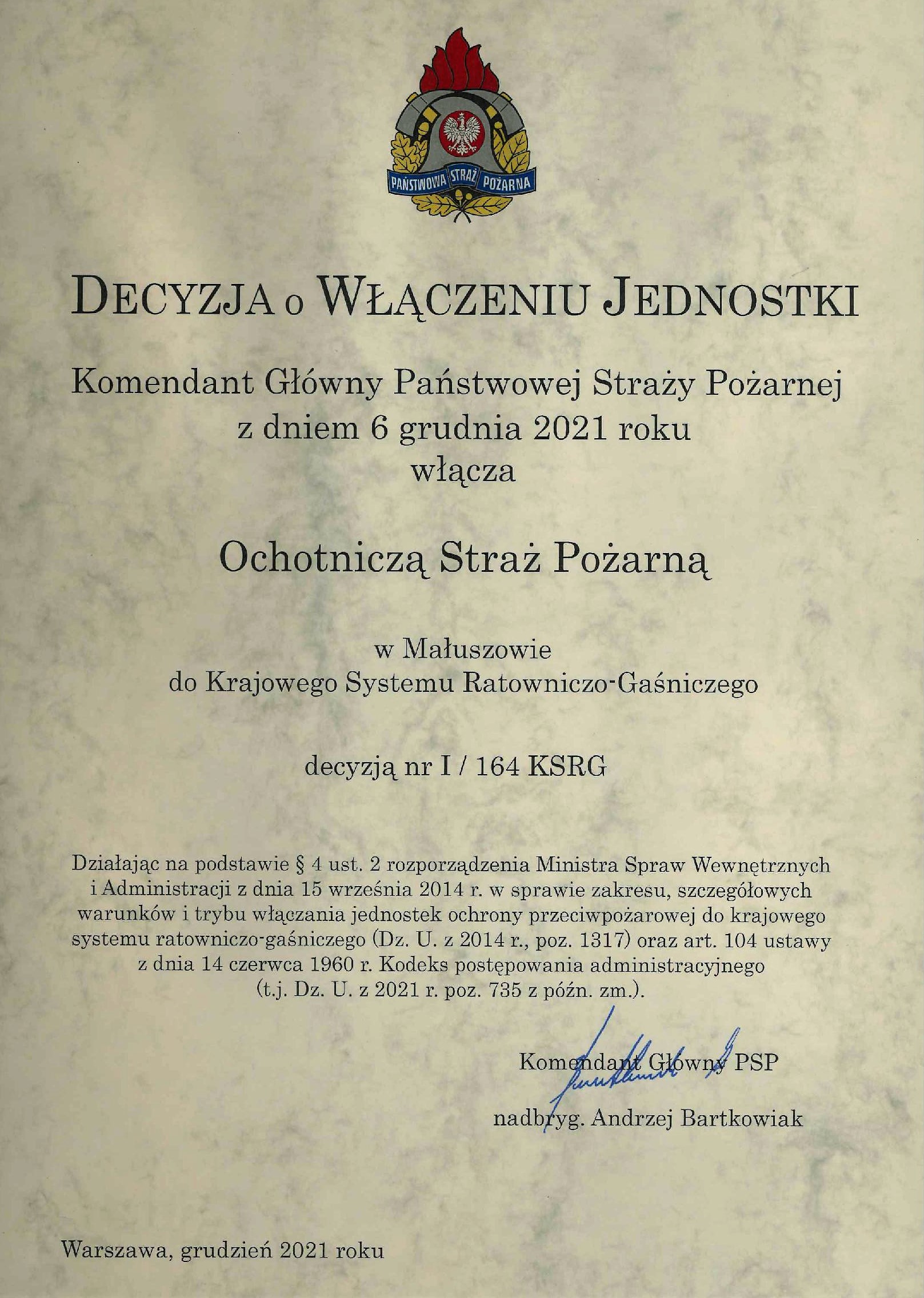 Przekazanie decyzji o włączeniu OSP Małuszów do KSRG